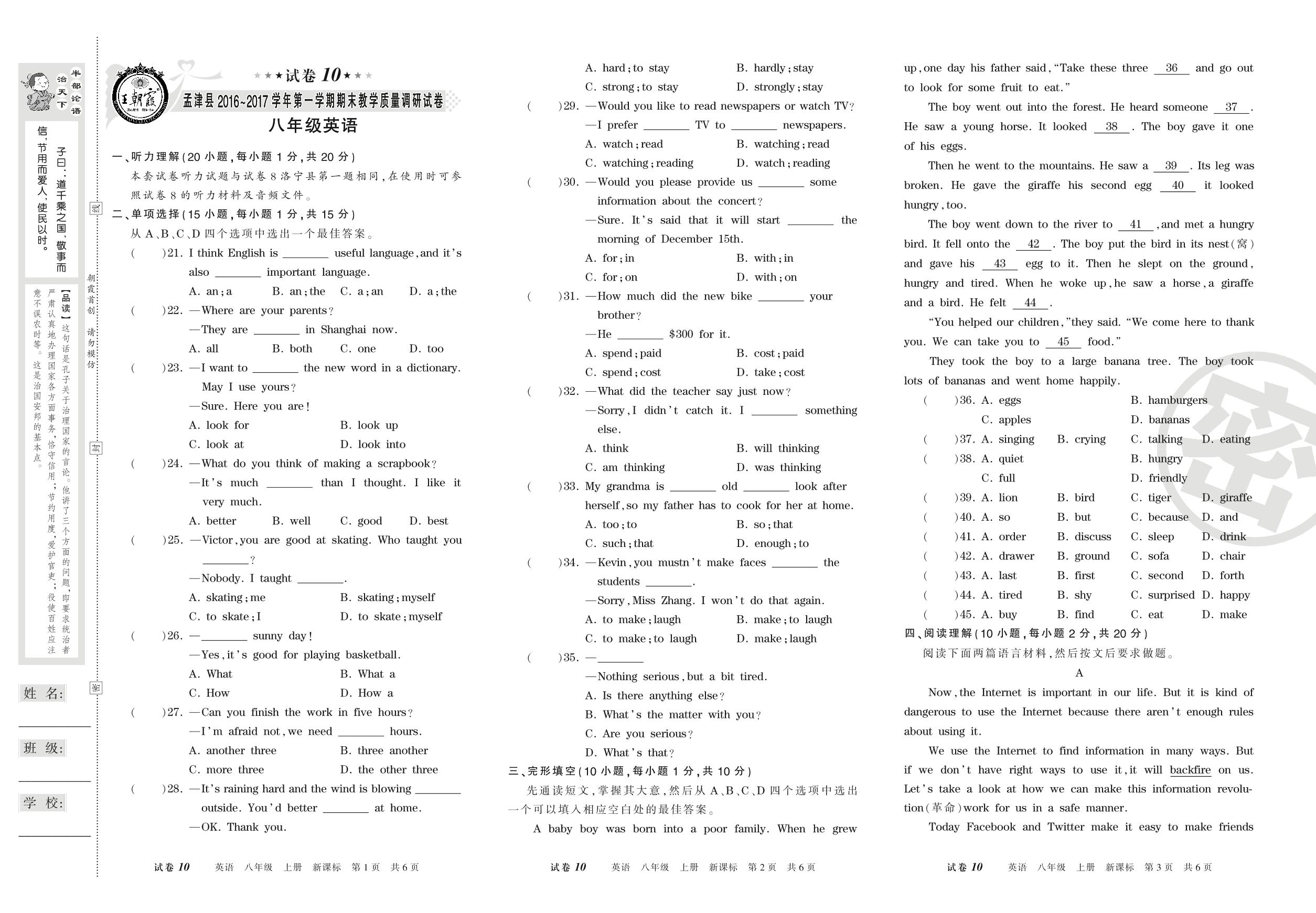 2016-2017学年第一学期洛阳市孟津县八年级英语试卷(新课版)【10】