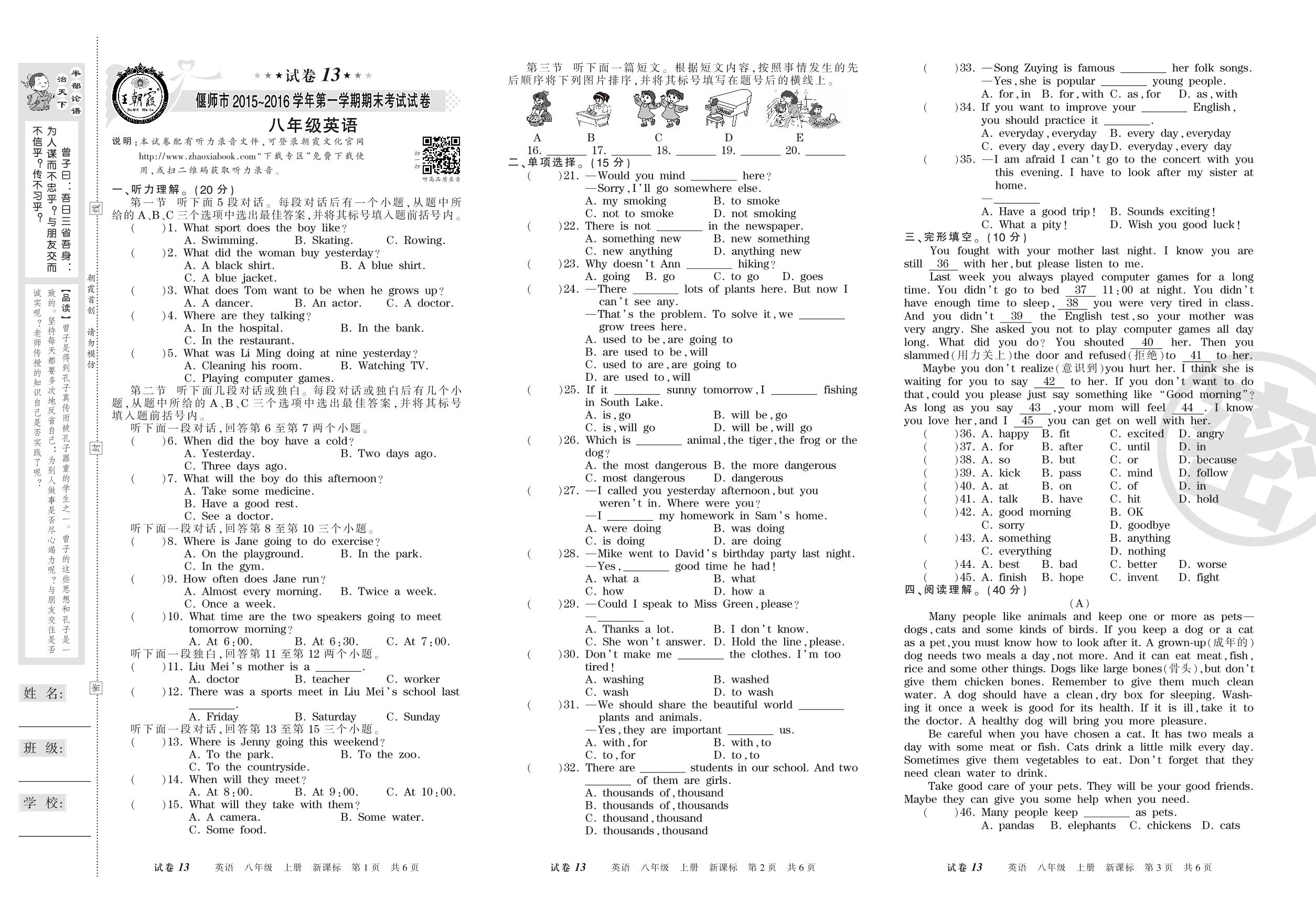 2016-2017学年第一学期偃师市八年级英语试卷(新课版)【13】