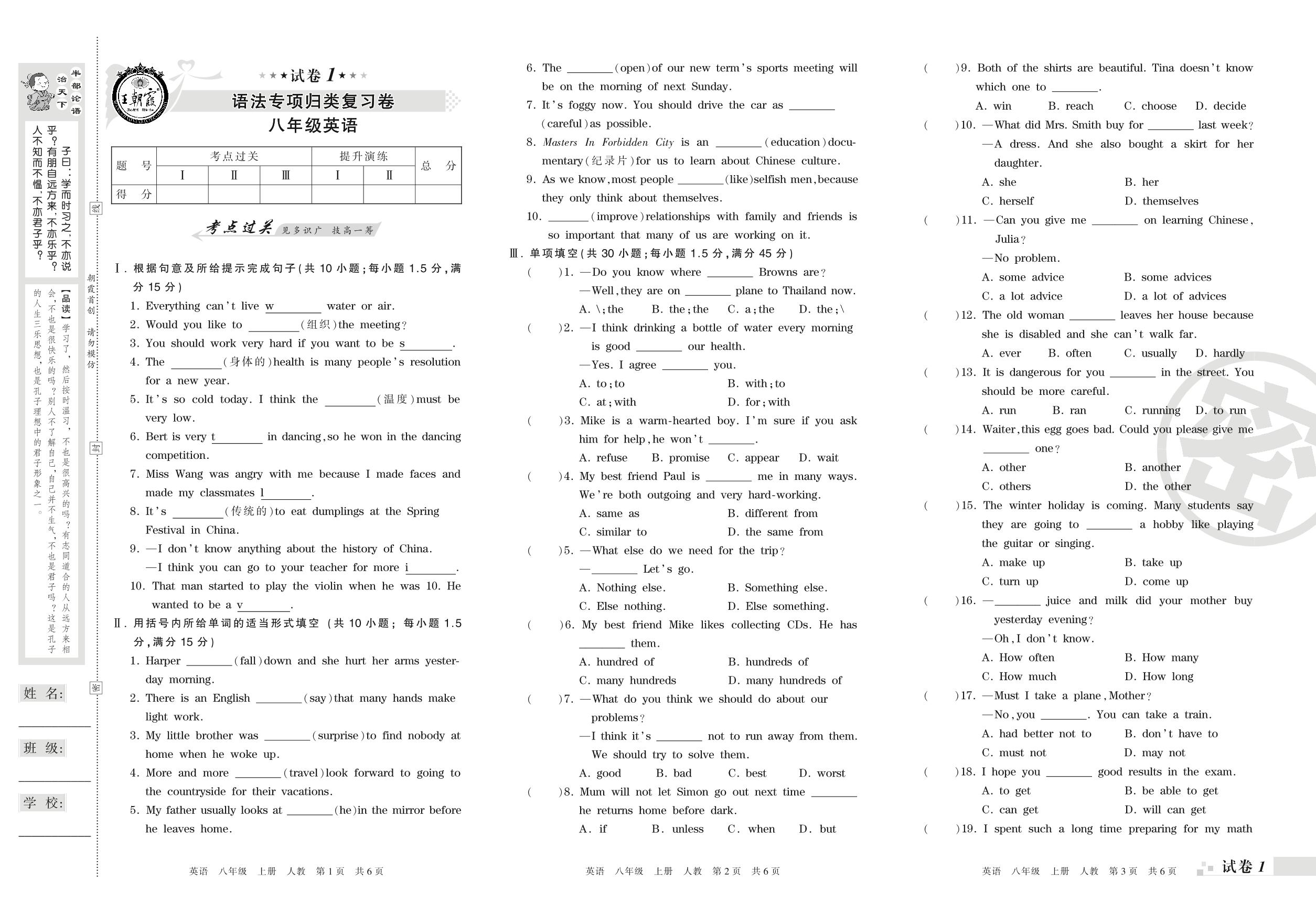 八年级英语人教版上册专项卷