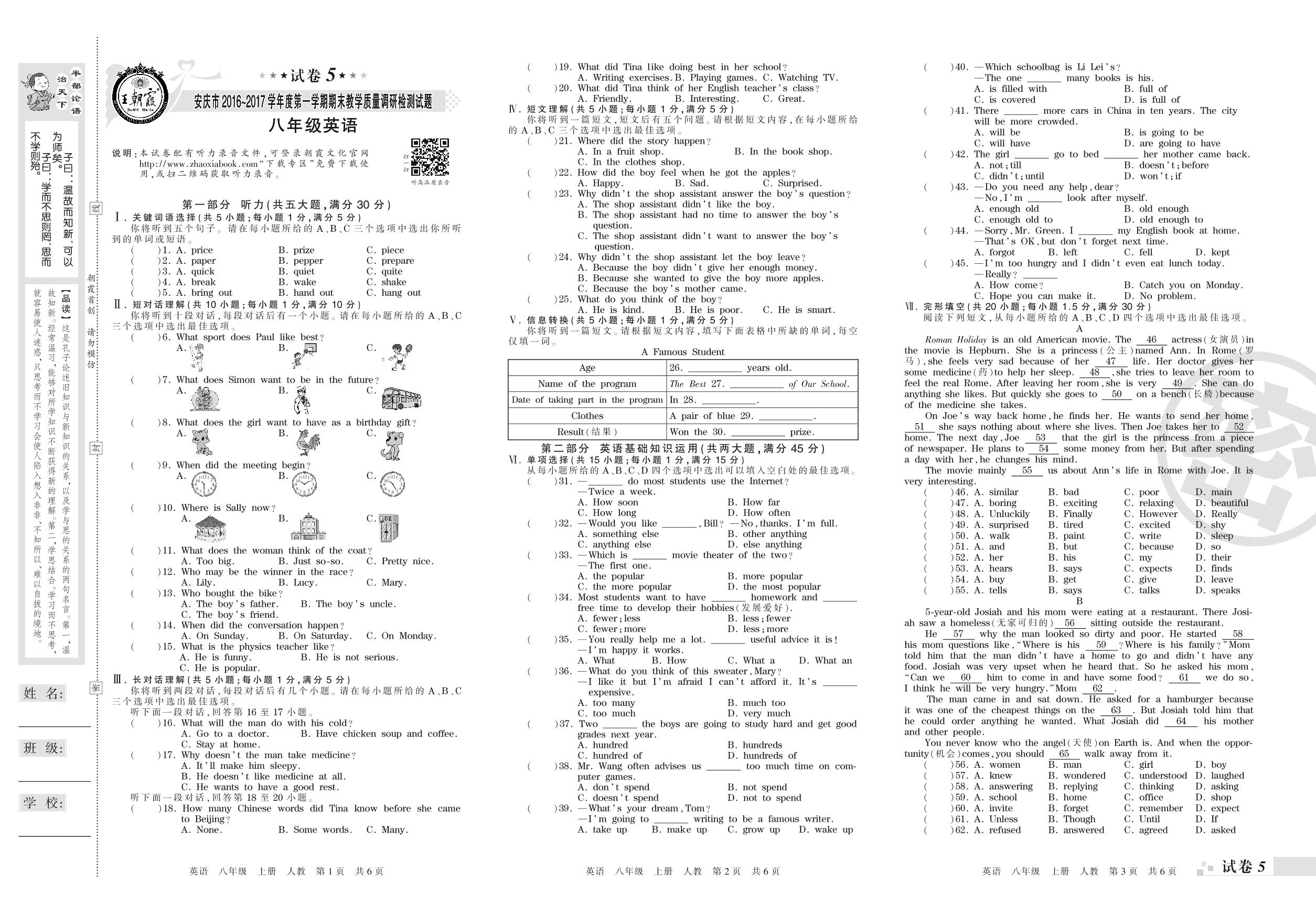 2016-2017学年第一学期安庆市八年级英语试卷(人教版)【5】