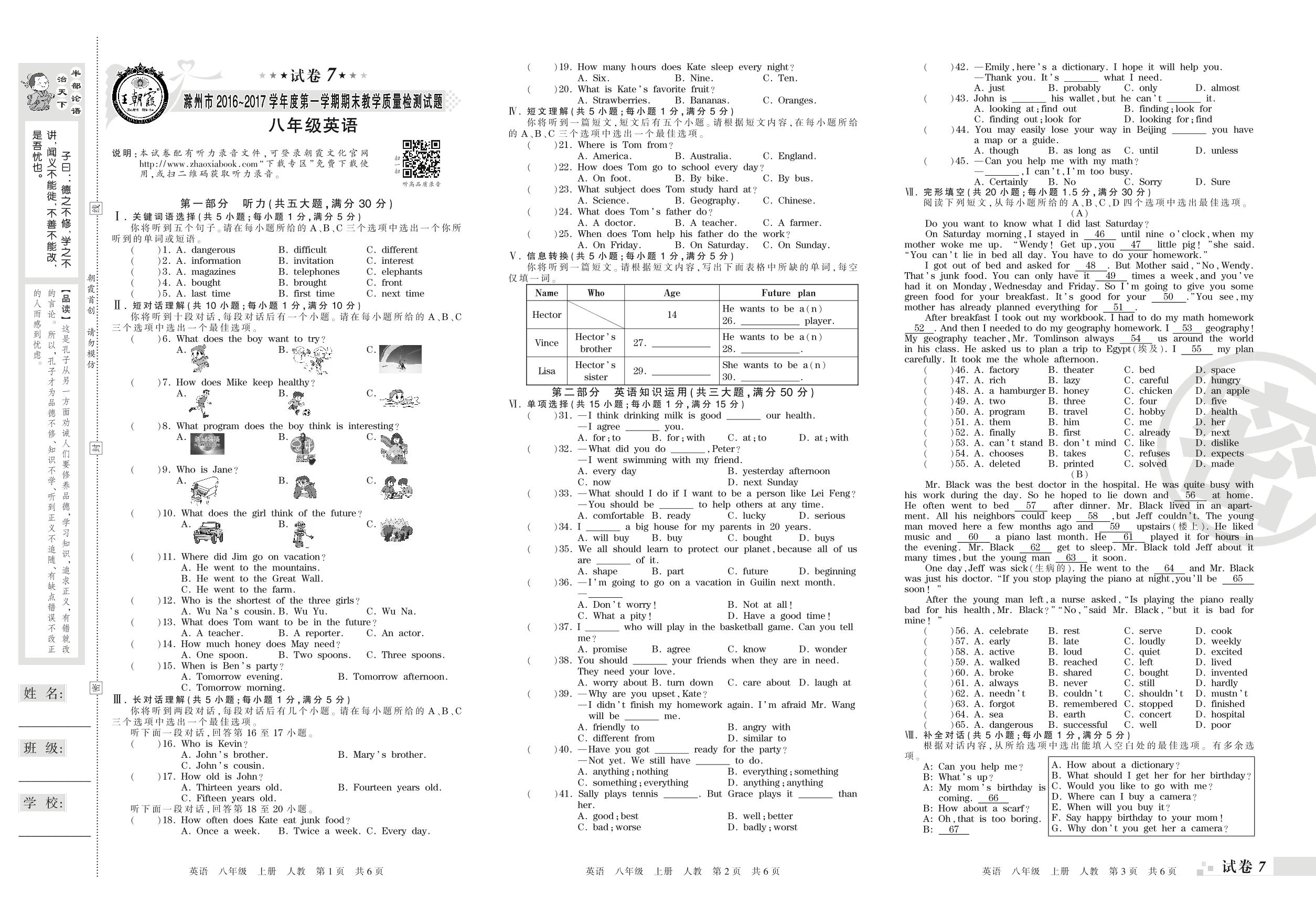 2016-2017学年第一学期滁州市八年级英语试卷(人教版)【7】