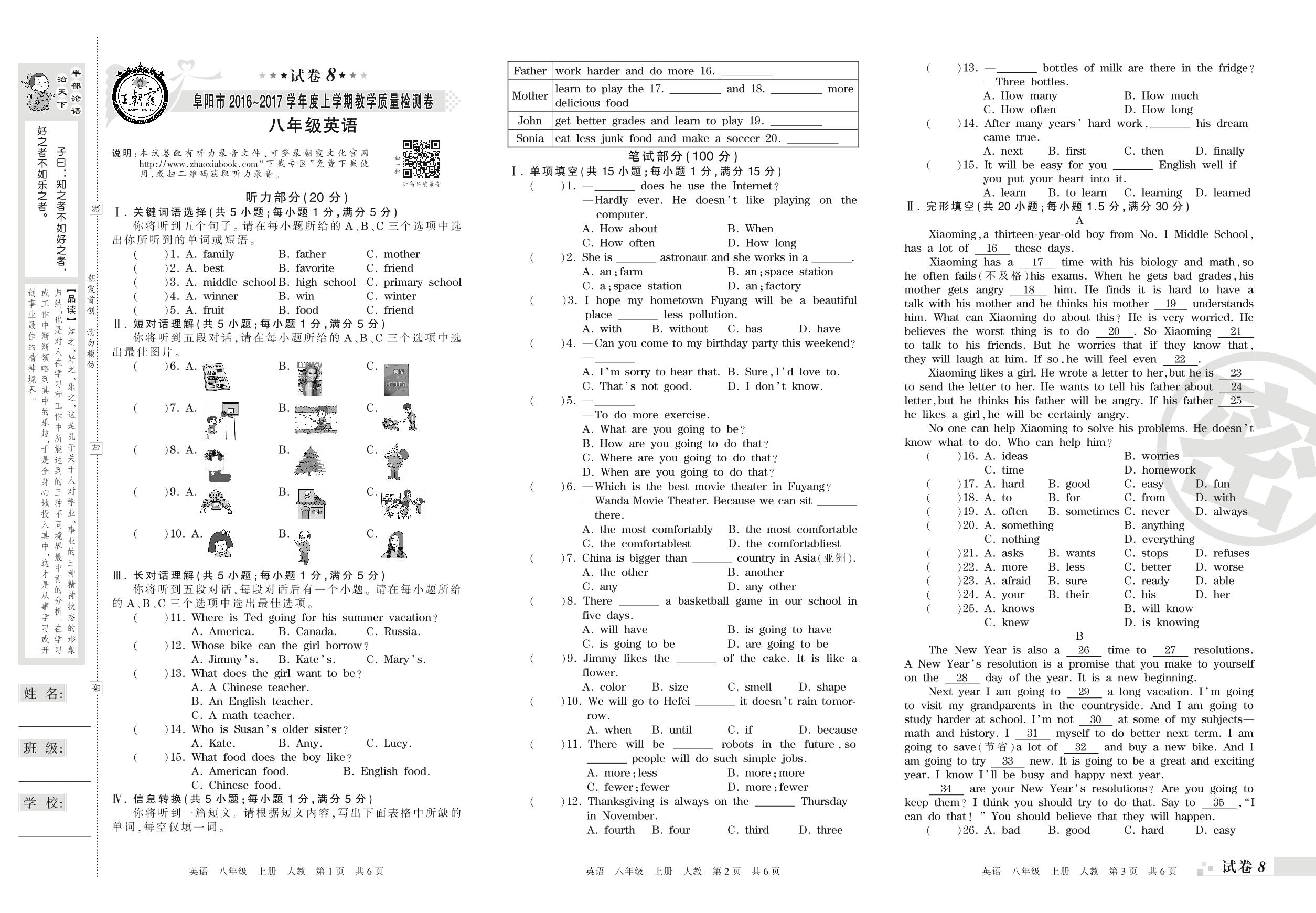 2016-2017学年第一学期阜阳市八年级英语试卷(人教版)【8】