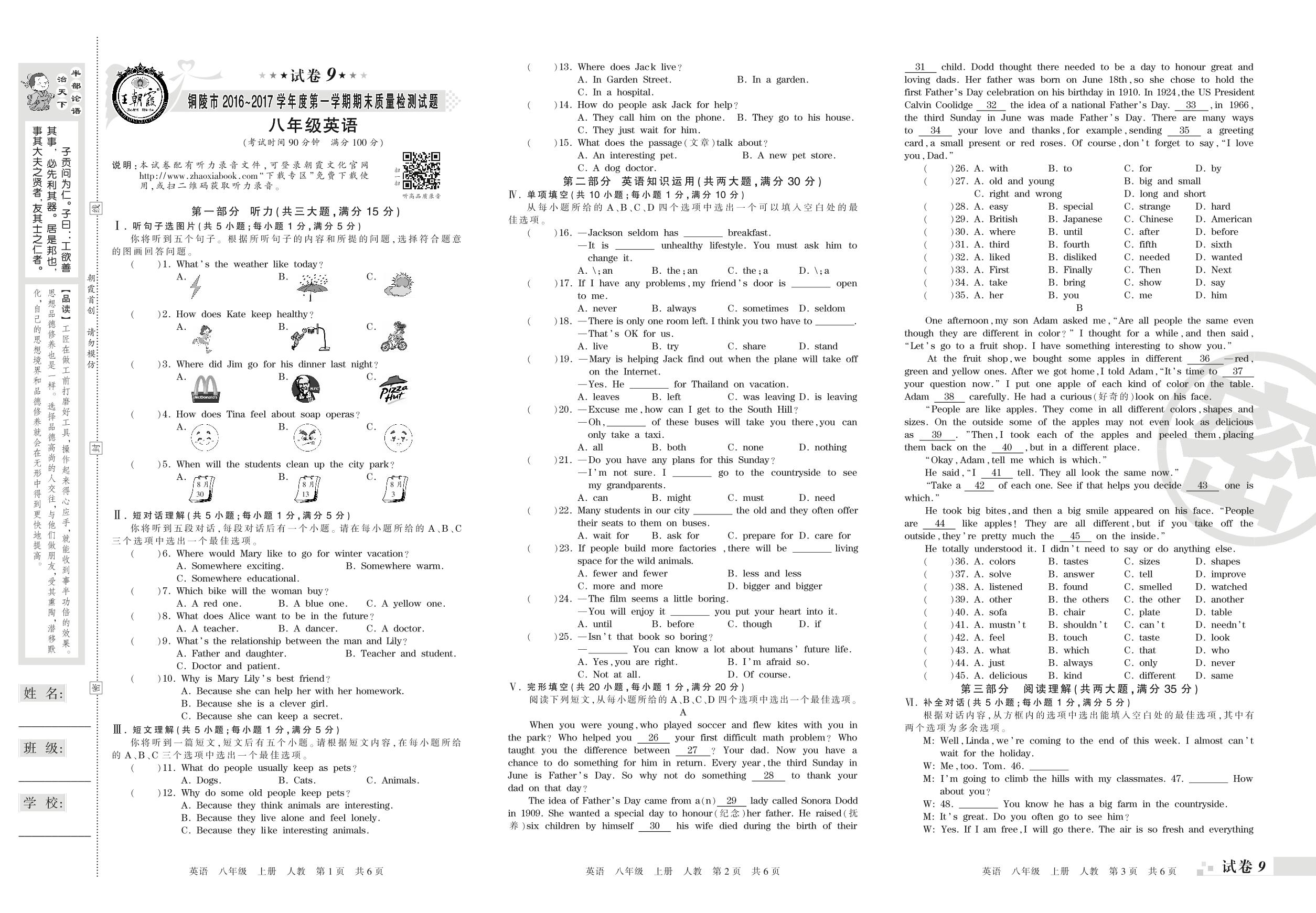 2016-2017学年第一学期铜陵市八年级英语试卷(人教版)【9】