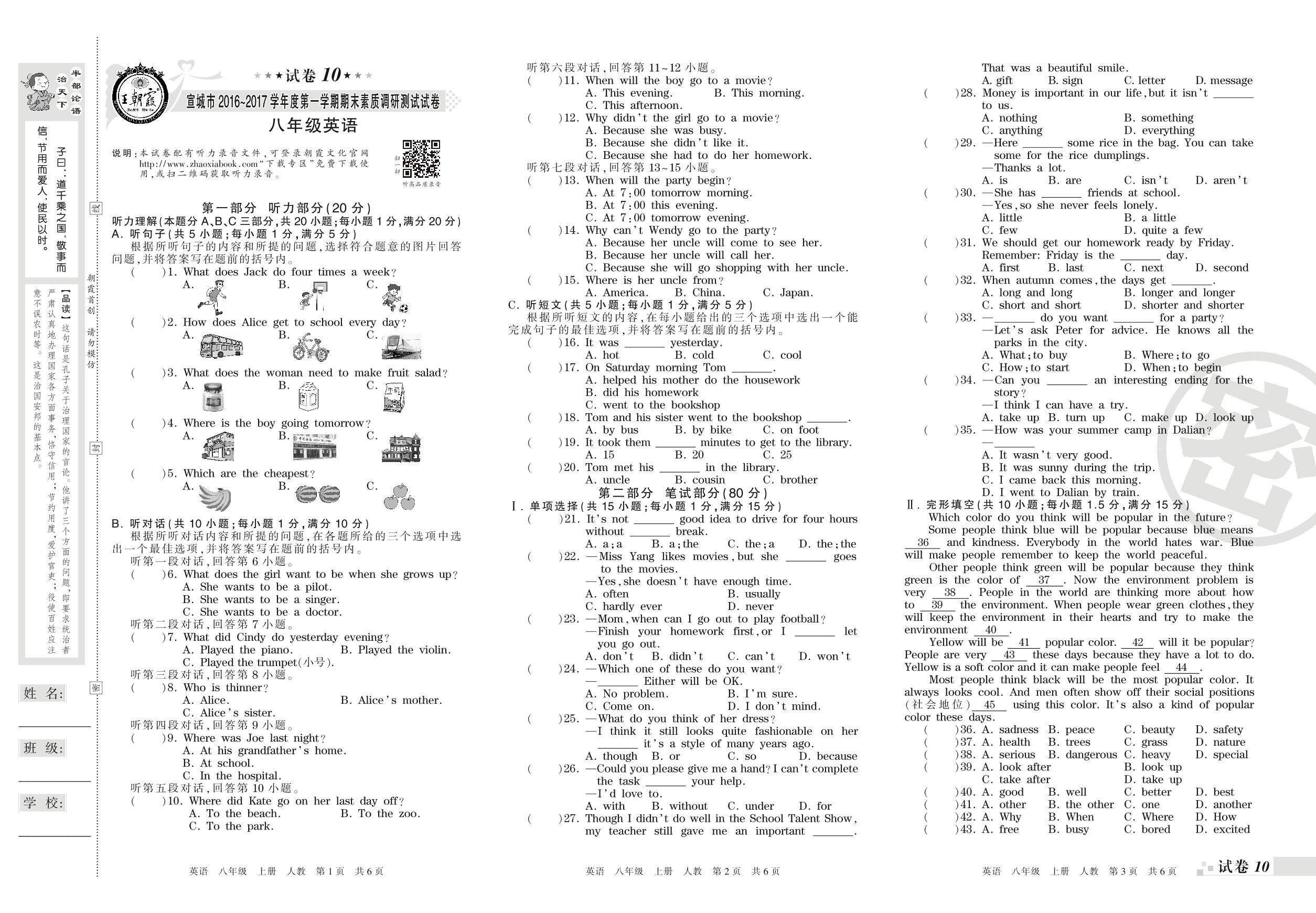 2016-2017学年第一学期宣城市八年级英语试卷(人教版)【10】