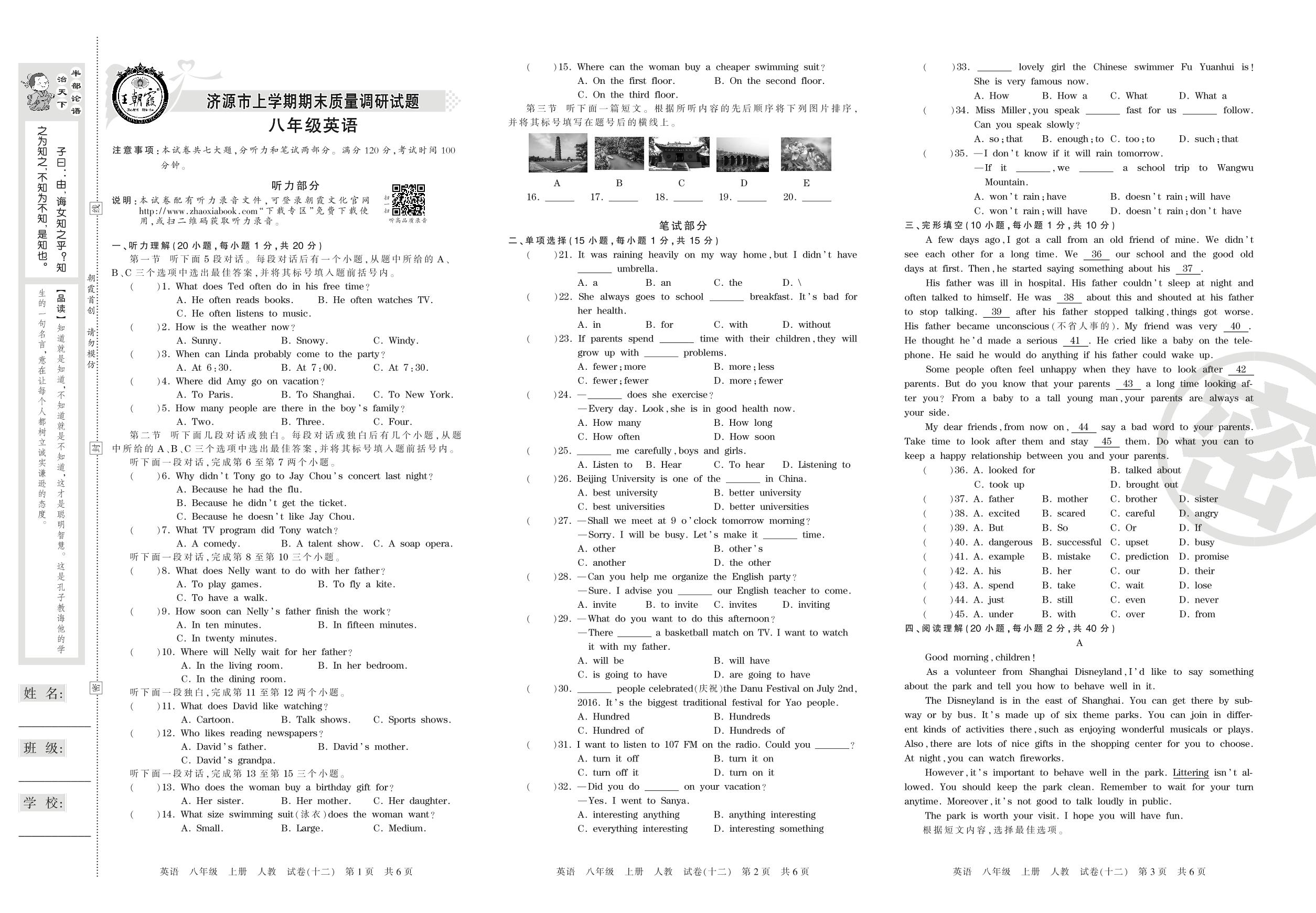 2016-2017学年第一学期济源市八年级英语试卷(人教版)【12】