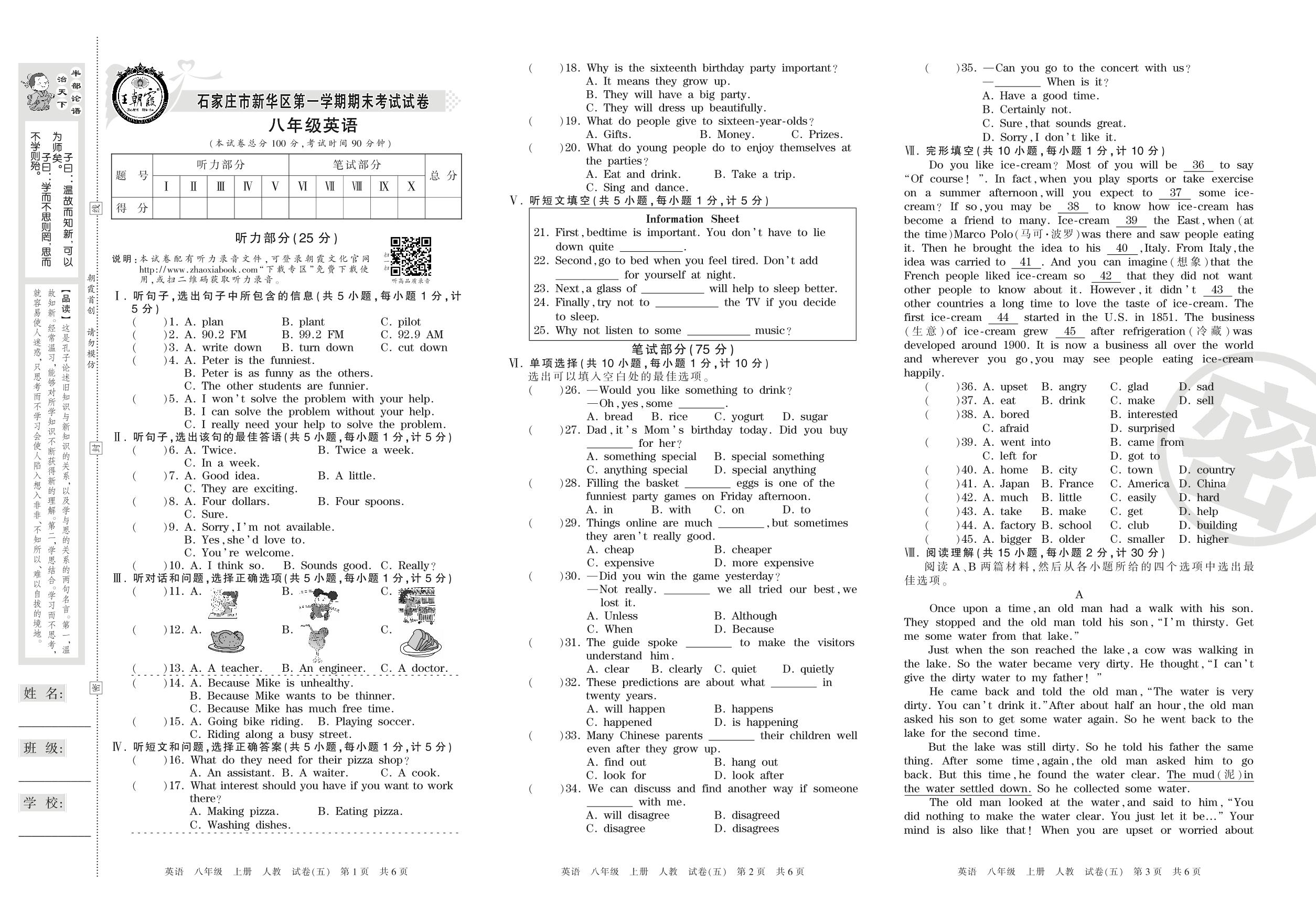 2016-2017学年第一学期石家庄市新华区八年级英语试卷(人教版)【5】