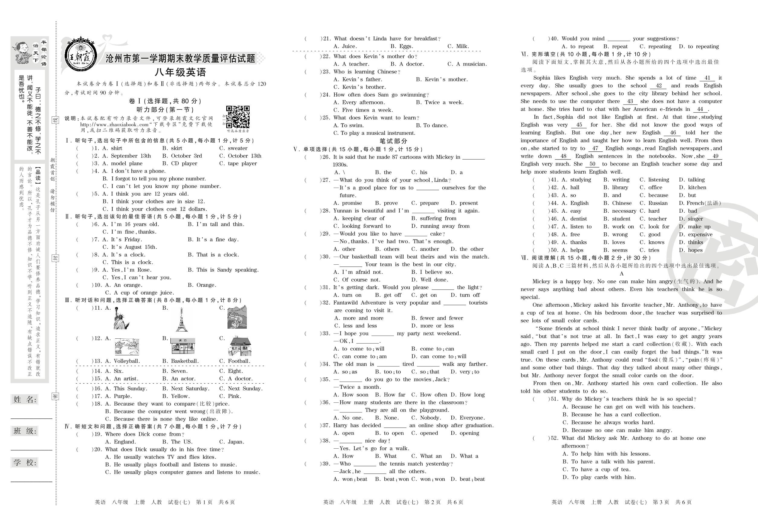 2016-2017学年第一学期沧州市八年级英语试卷(人教版)【7】