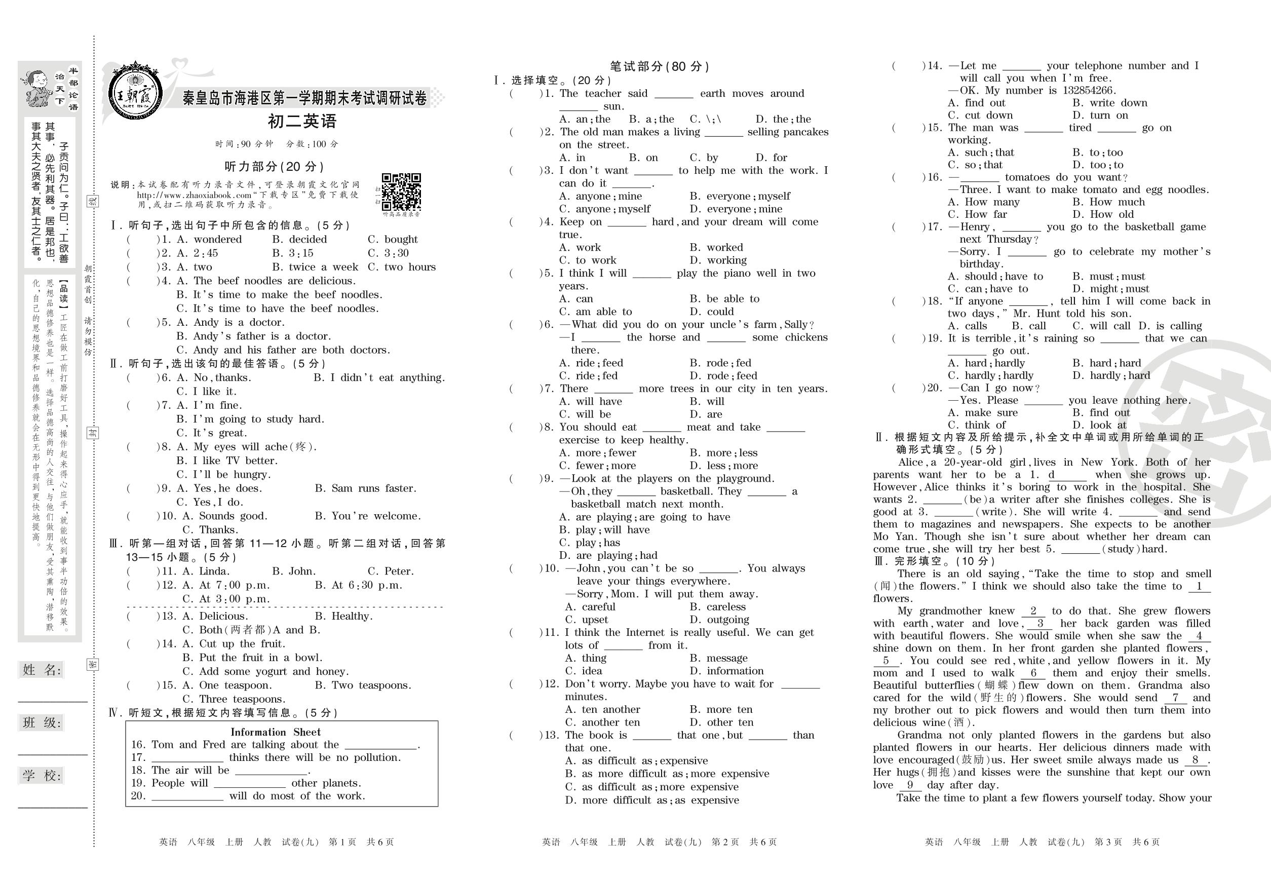 2016-2017学年第一学期秦皇岛市海港区八年级英语试卷(人教版)【9】