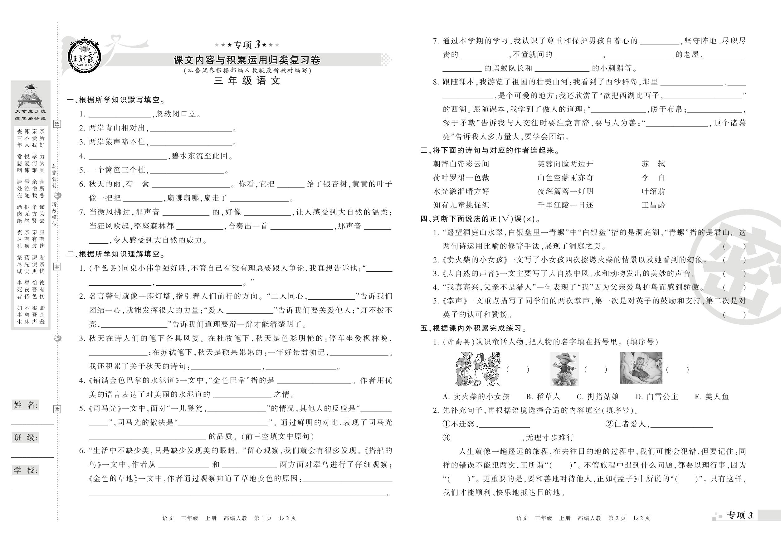 王朝霞期末专项卷——课文内容与积累运用、课内阅读与写作真题归类复习卷三年级上册语文(人教版)_R21080191755【0】