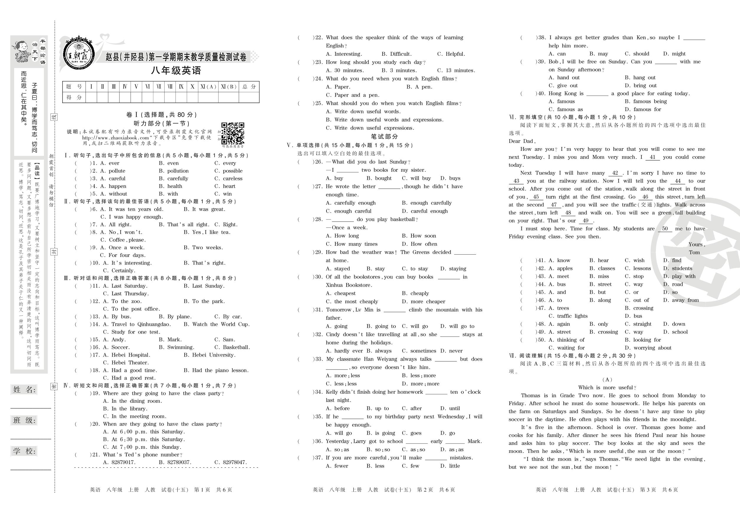 2016-2017学年第一学期石家庄市赵县(井陉县)八年级英语试卷(人教版)【15】