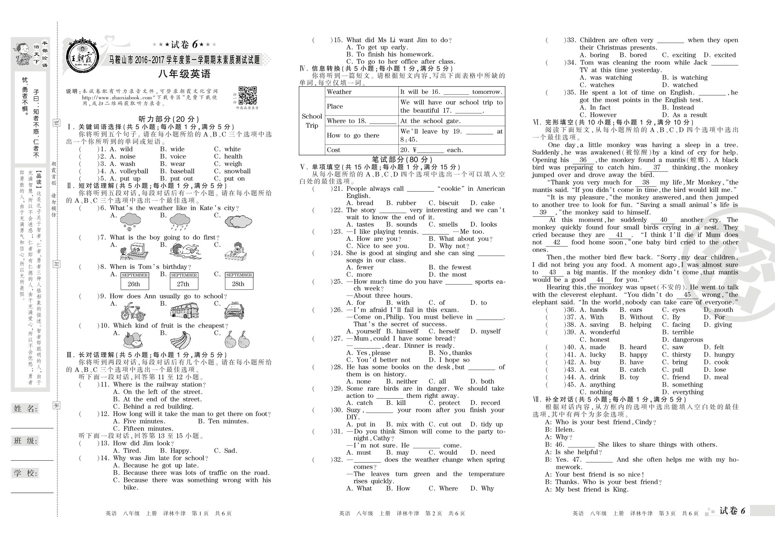 2016-2017学年第一学期马鞍山市八年级英语试卷(译林版)【6】