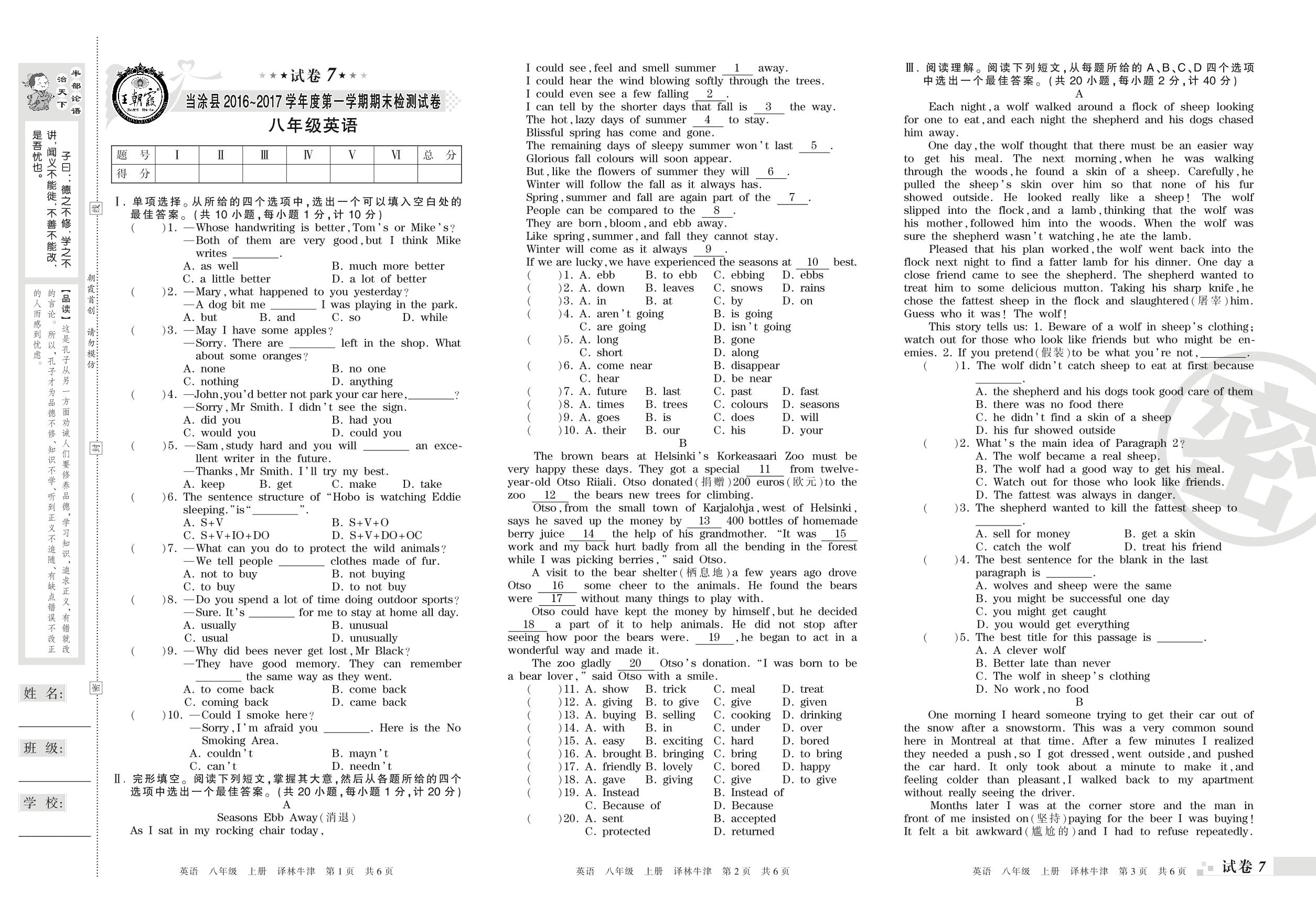 2016-2017学年第一学期马鞍山市当涂县八年级英语试卷(译林版)【7】