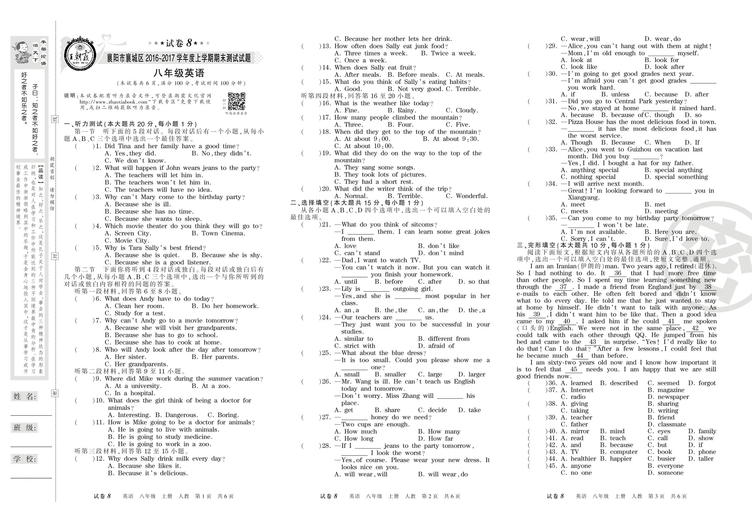 2016-2017学年第一学期襄阳市襄城区八年级英语试卷(人教版)【8】