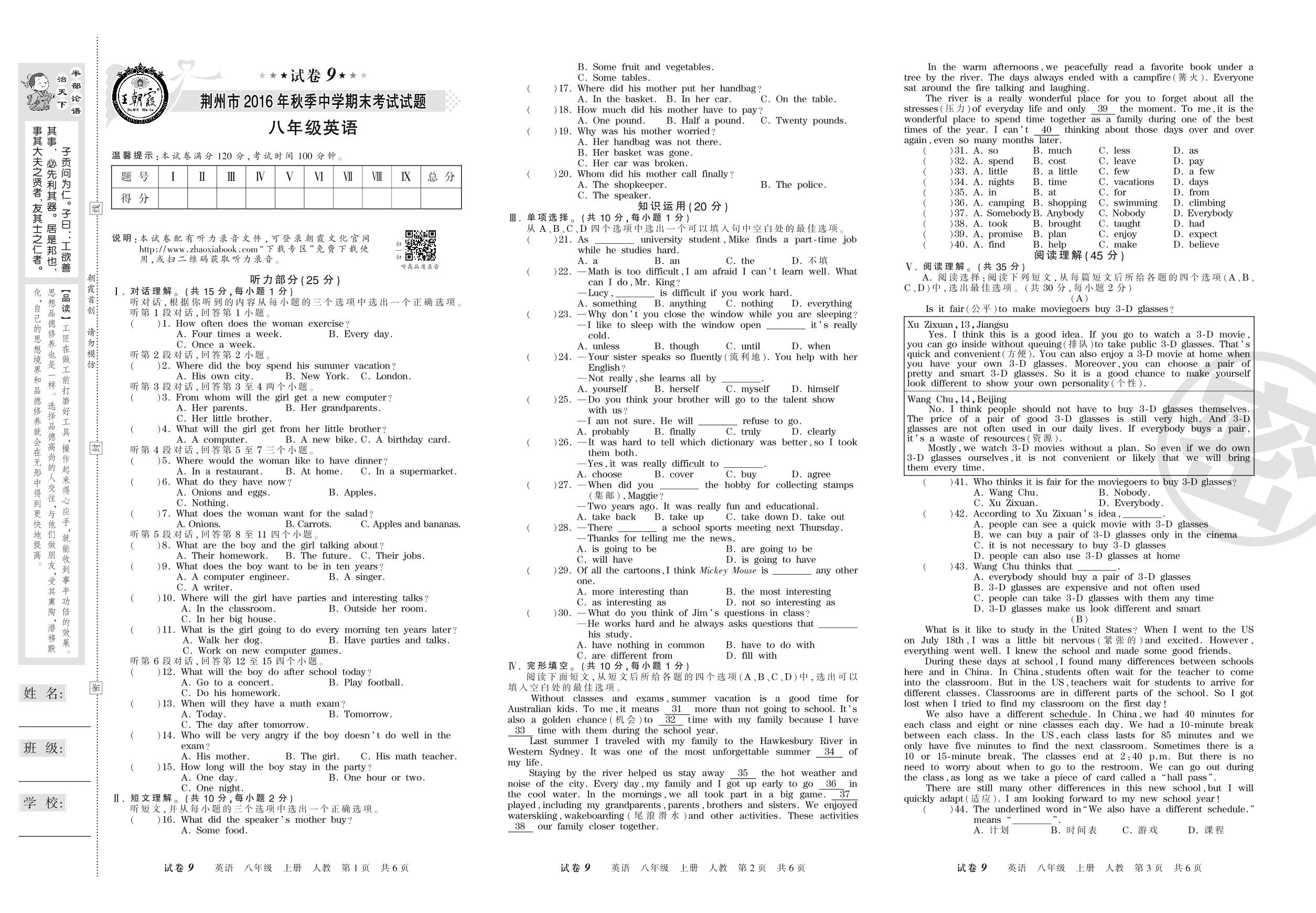 2016-2017学年第一学期荆州市八年级英语试卷(人教版)【9】