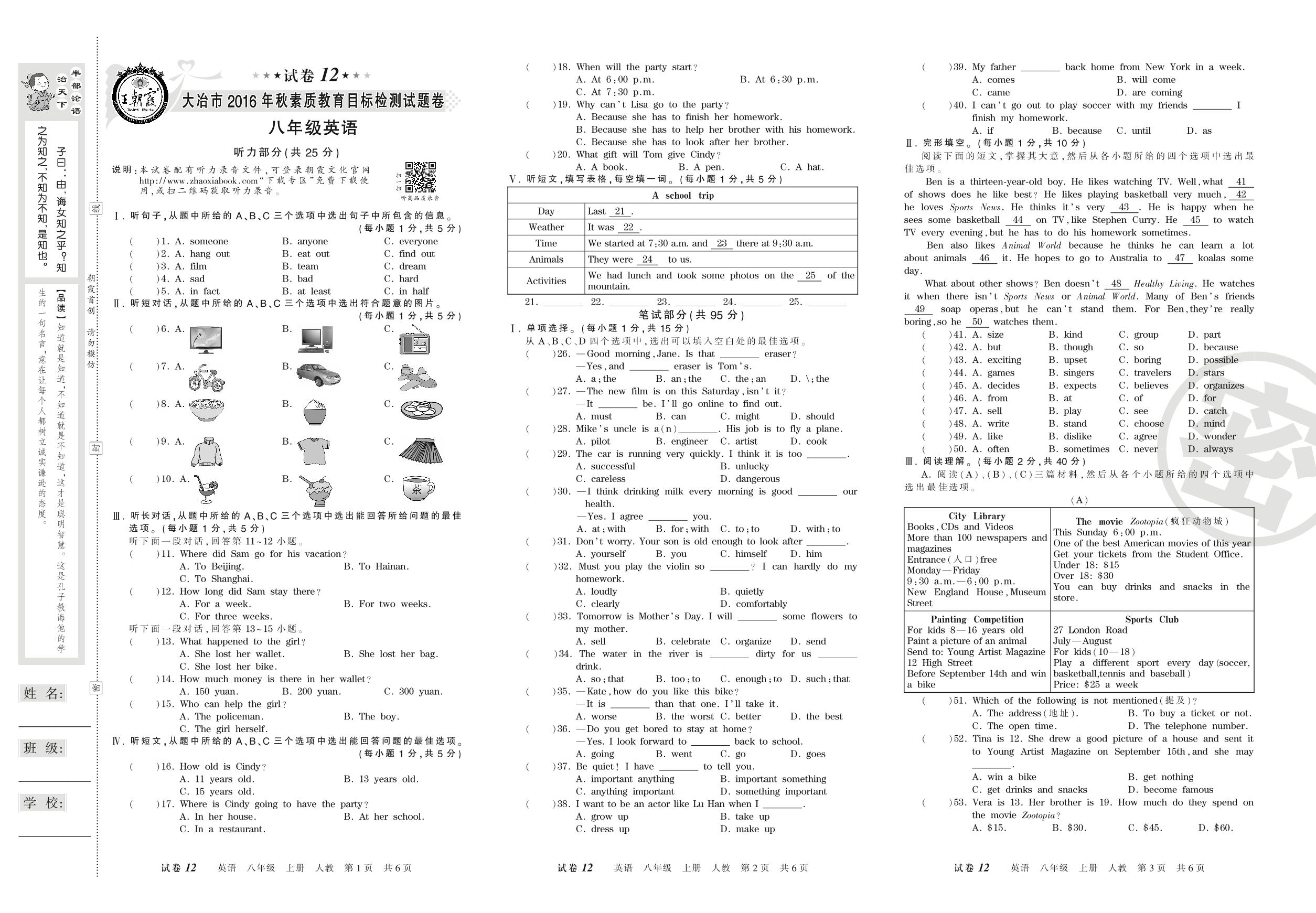 2016-2017学年第一学期大冶市八年级英语试卷(人教版)【12】