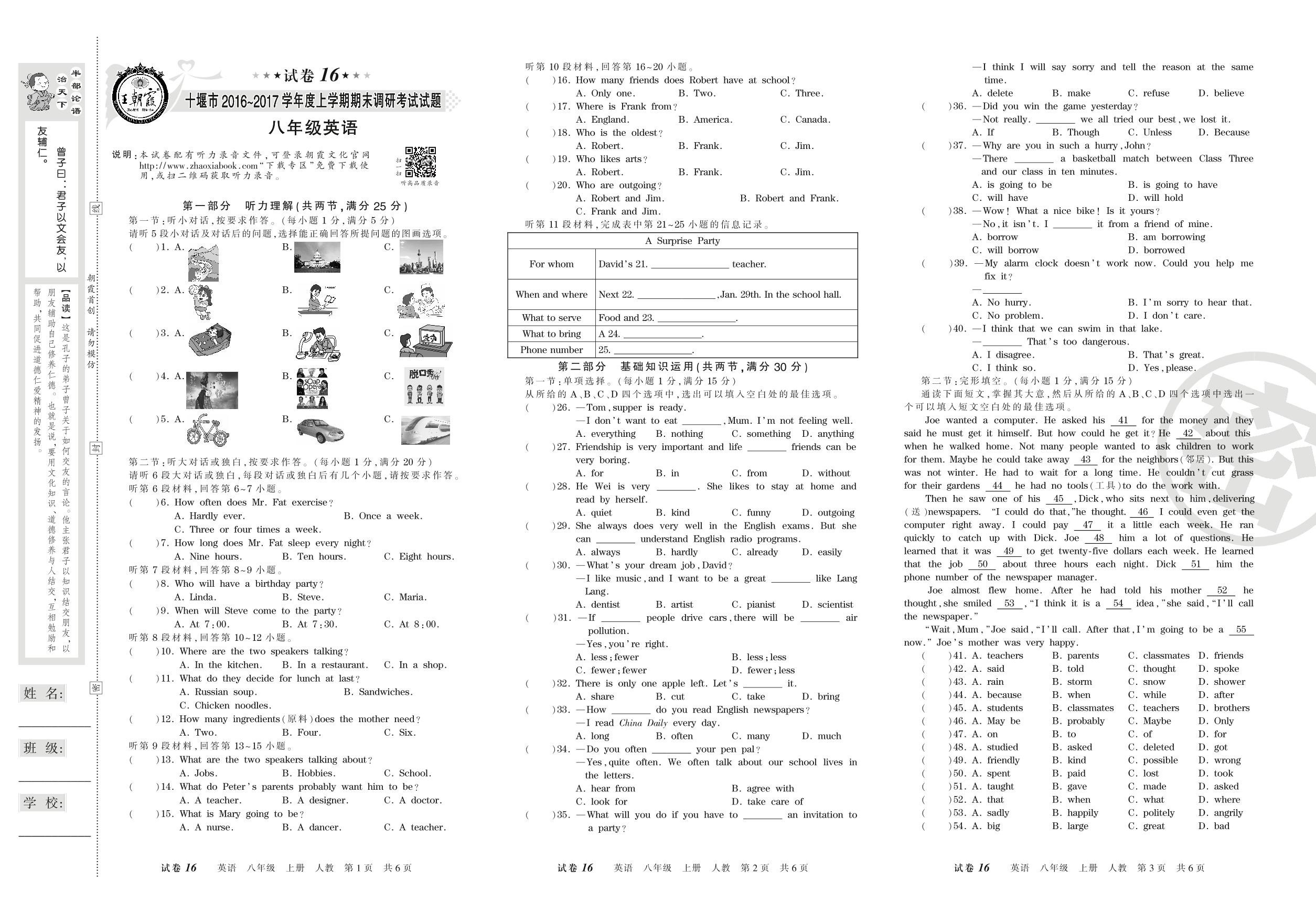2016-2017学年第一学期十堰市八年级英语试卷(人教版)【16】