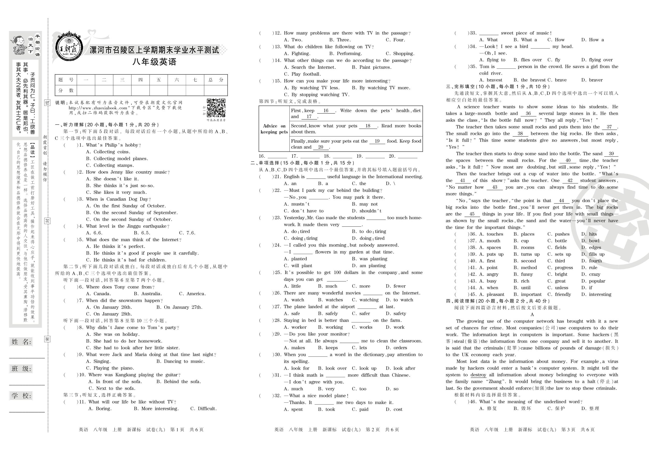 2016-2017学年第一学期漯河市召陵区八年级英语试卷(新课版)【9】