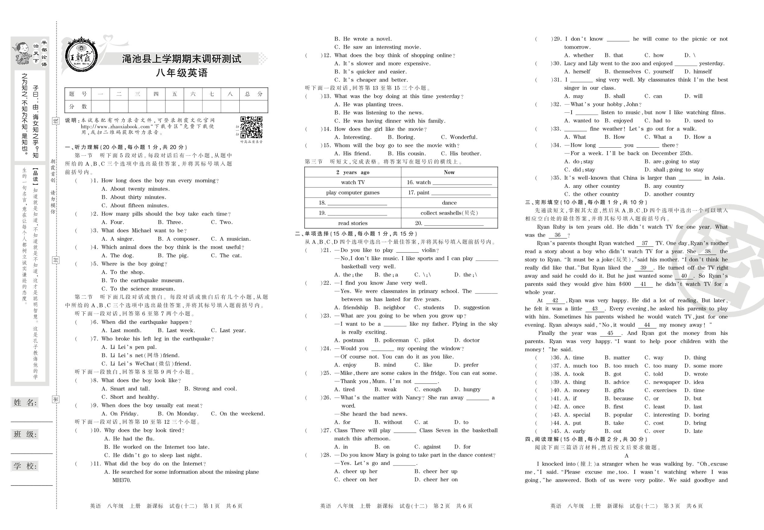 2016-2017学年第一学期三门峡市渑池县八年级英语试卷(新课版)【12】