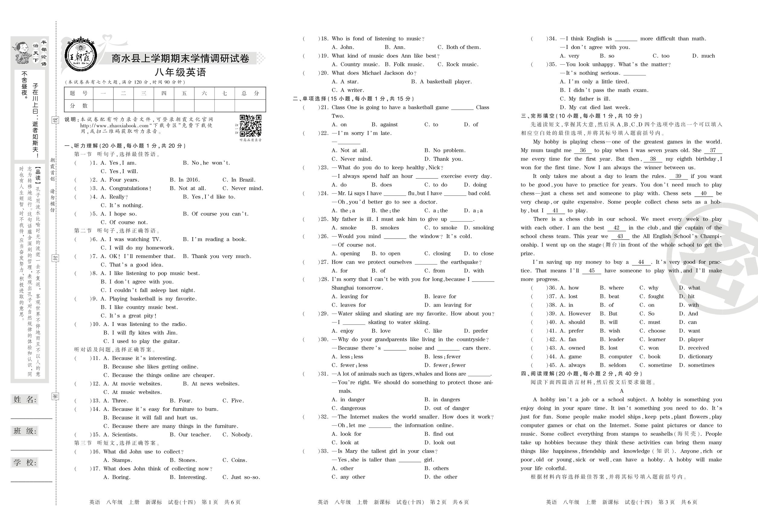 2016-2017学年第一学期周口市商水县八年级英语试卷(新课版)【14】