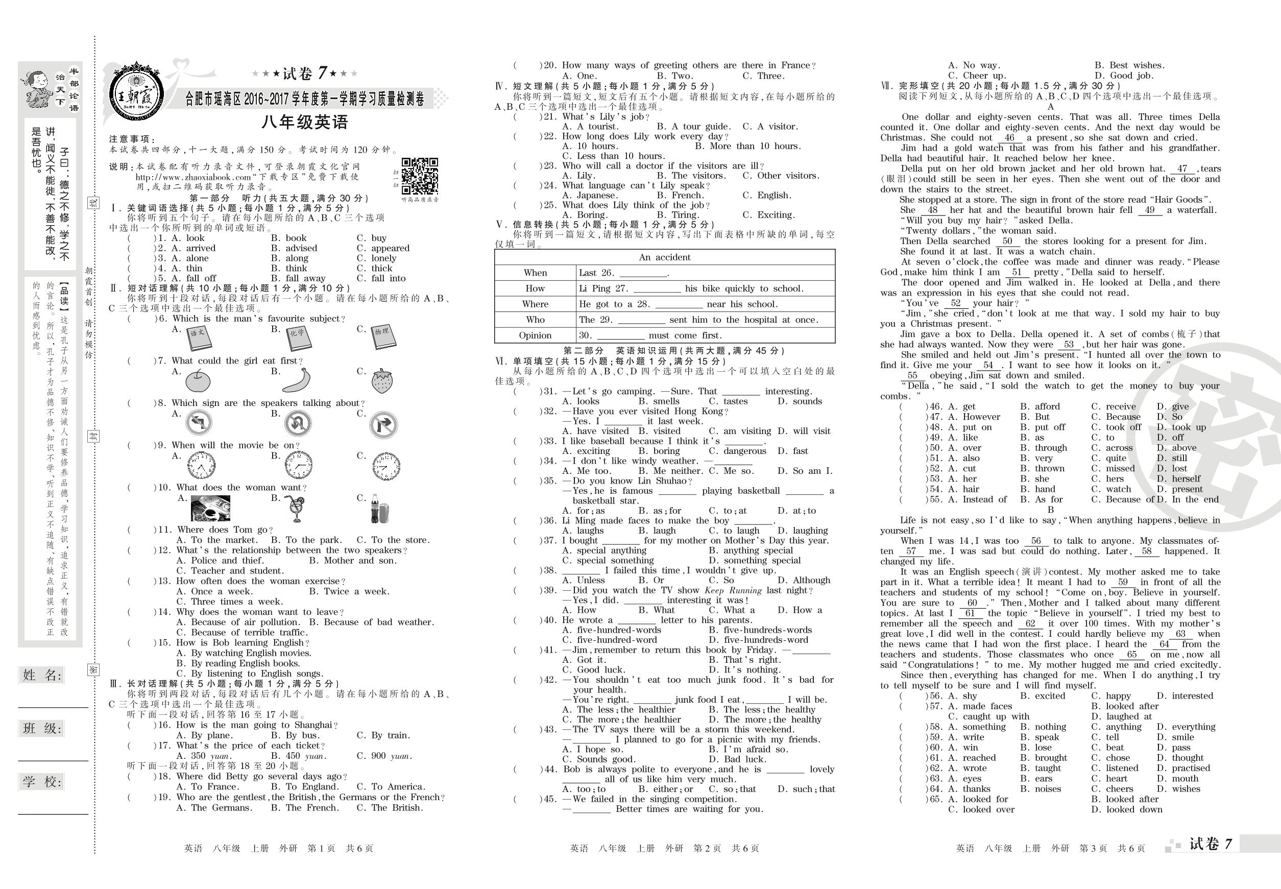 2016-2017学年第一学期合肥市瑶海区八年级英语试卷(外研版)【7】