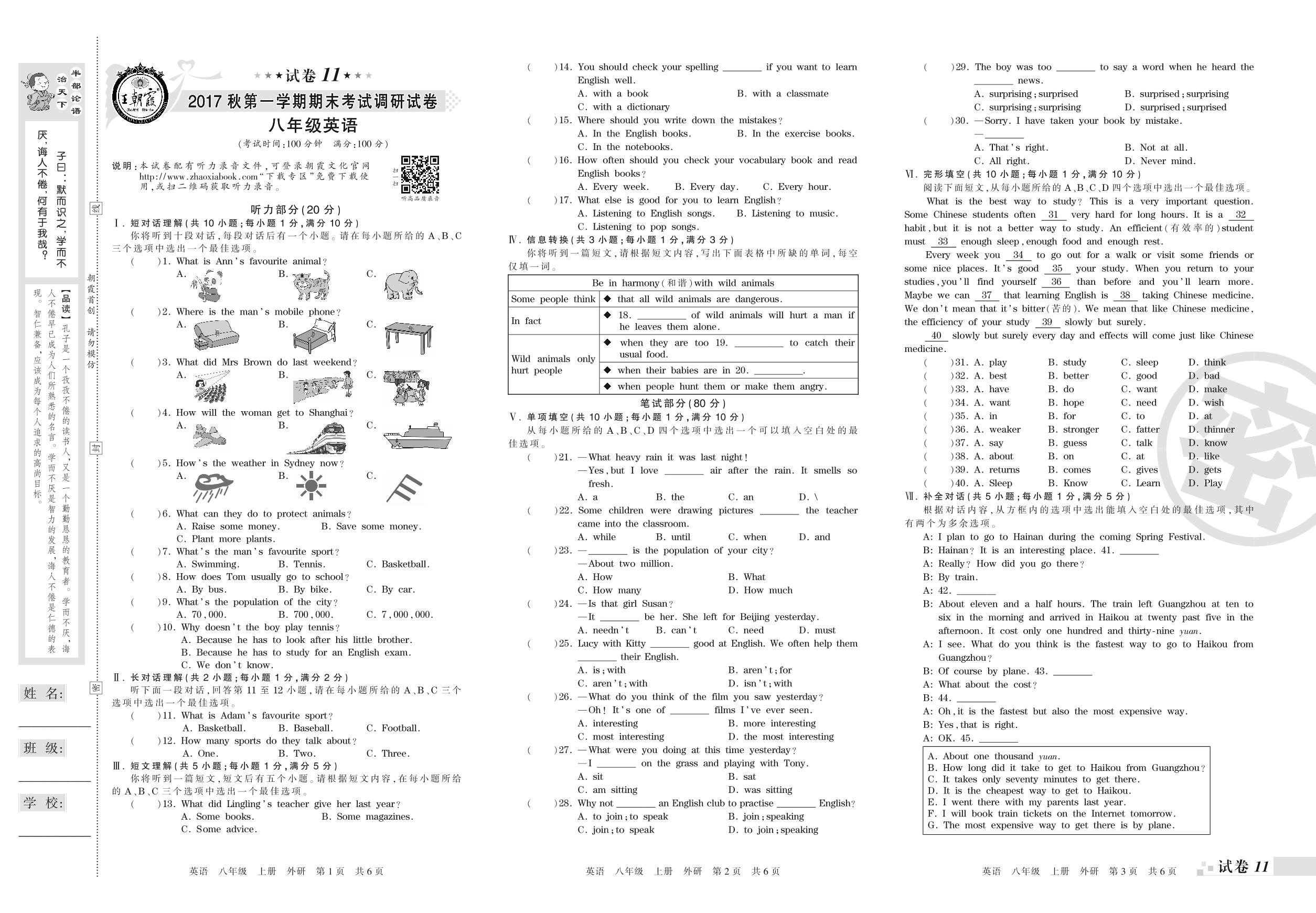 王朝霞期末调研卷八年级上册英语(外研版)【11】