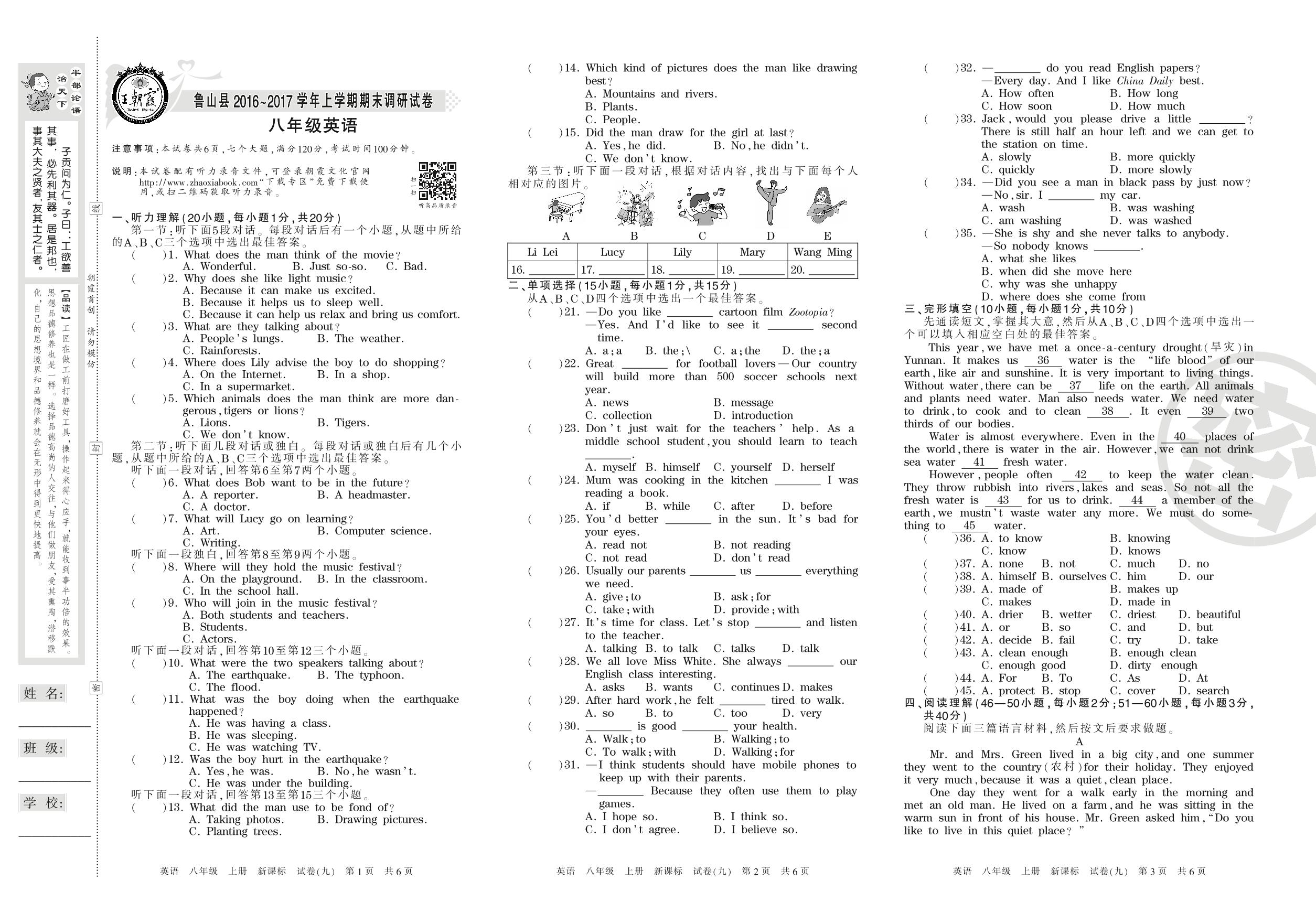 2016-2017学年第一学期平顶山市鲁山县八年级英语试卷(新课版)【9】