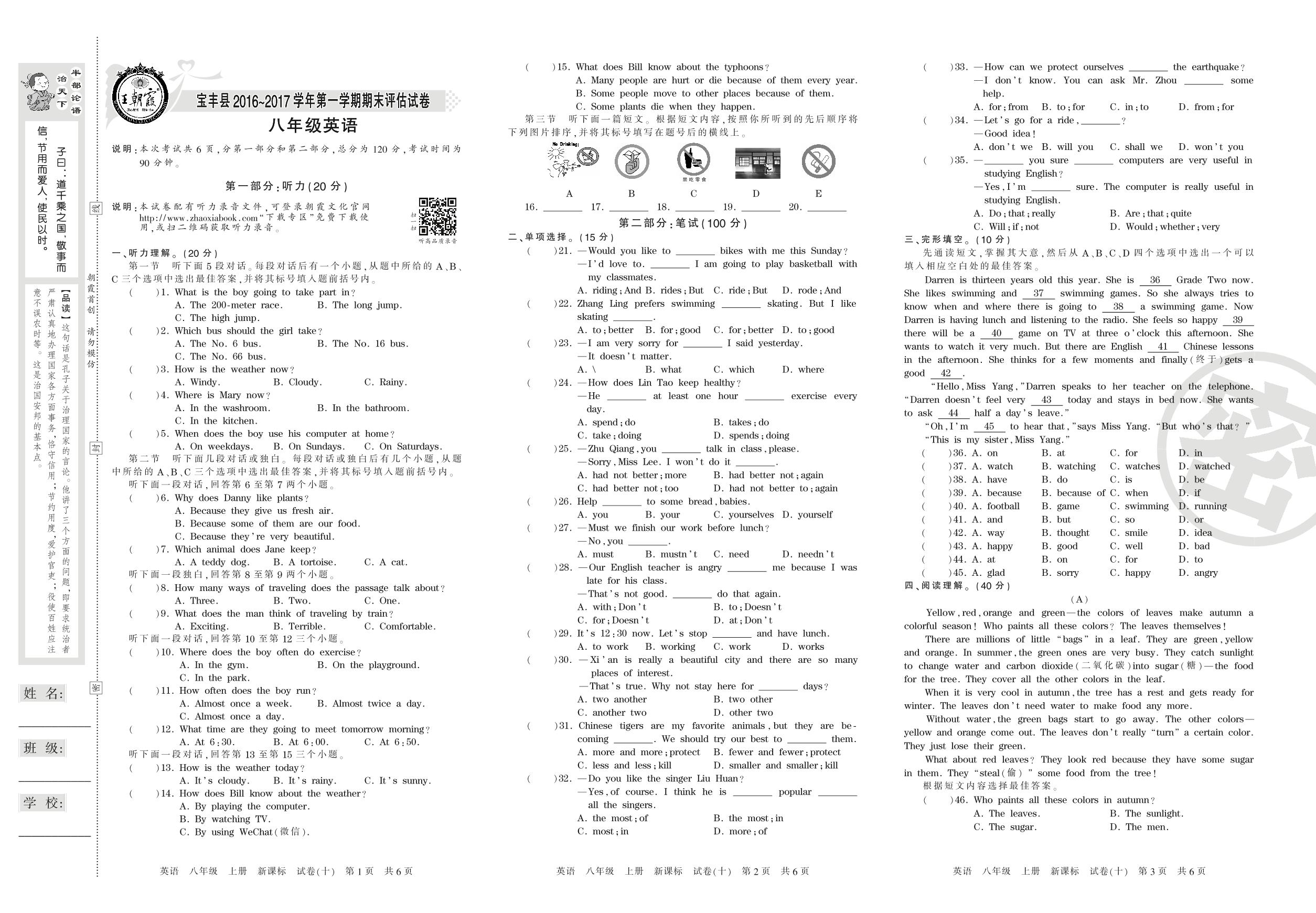 2016-2017学年第一学期平顶山市宝丰县八年级英语试卷(新课版)【10】