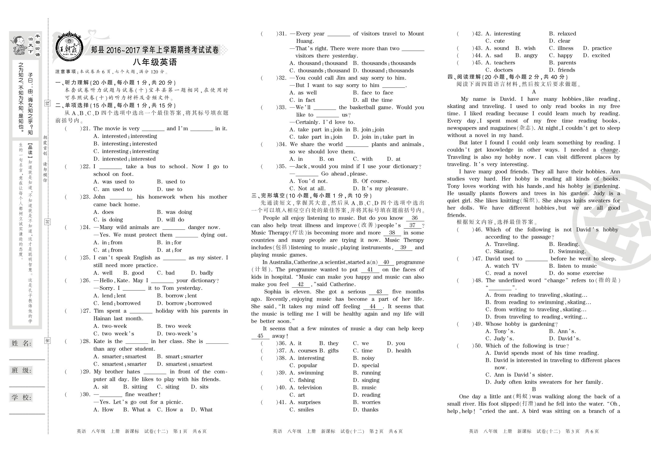 2016-2017学年第一学期平顶山市郏县八年级英语试卷(新课版)【12】