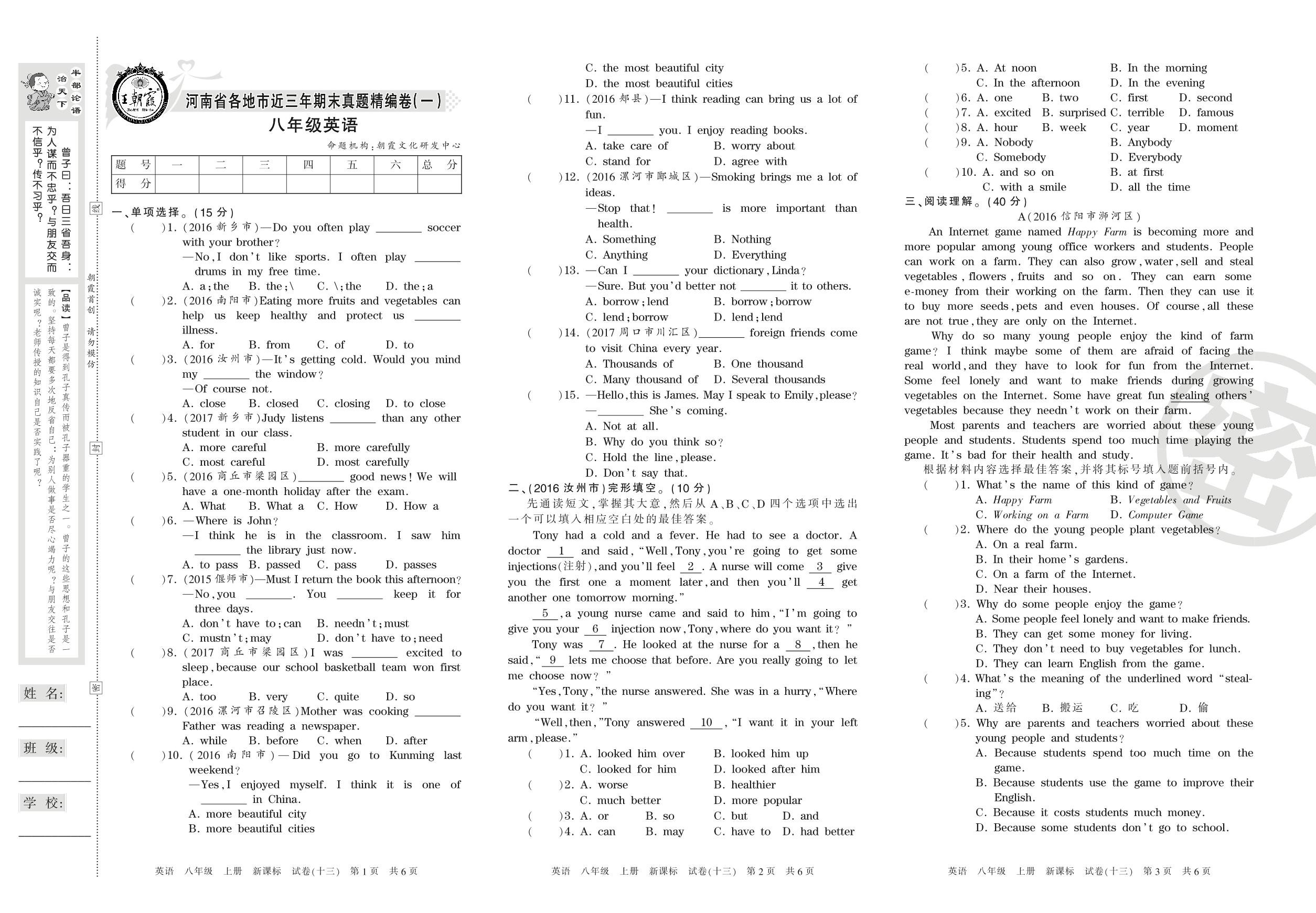 八年级英语新课标版上册期末卷