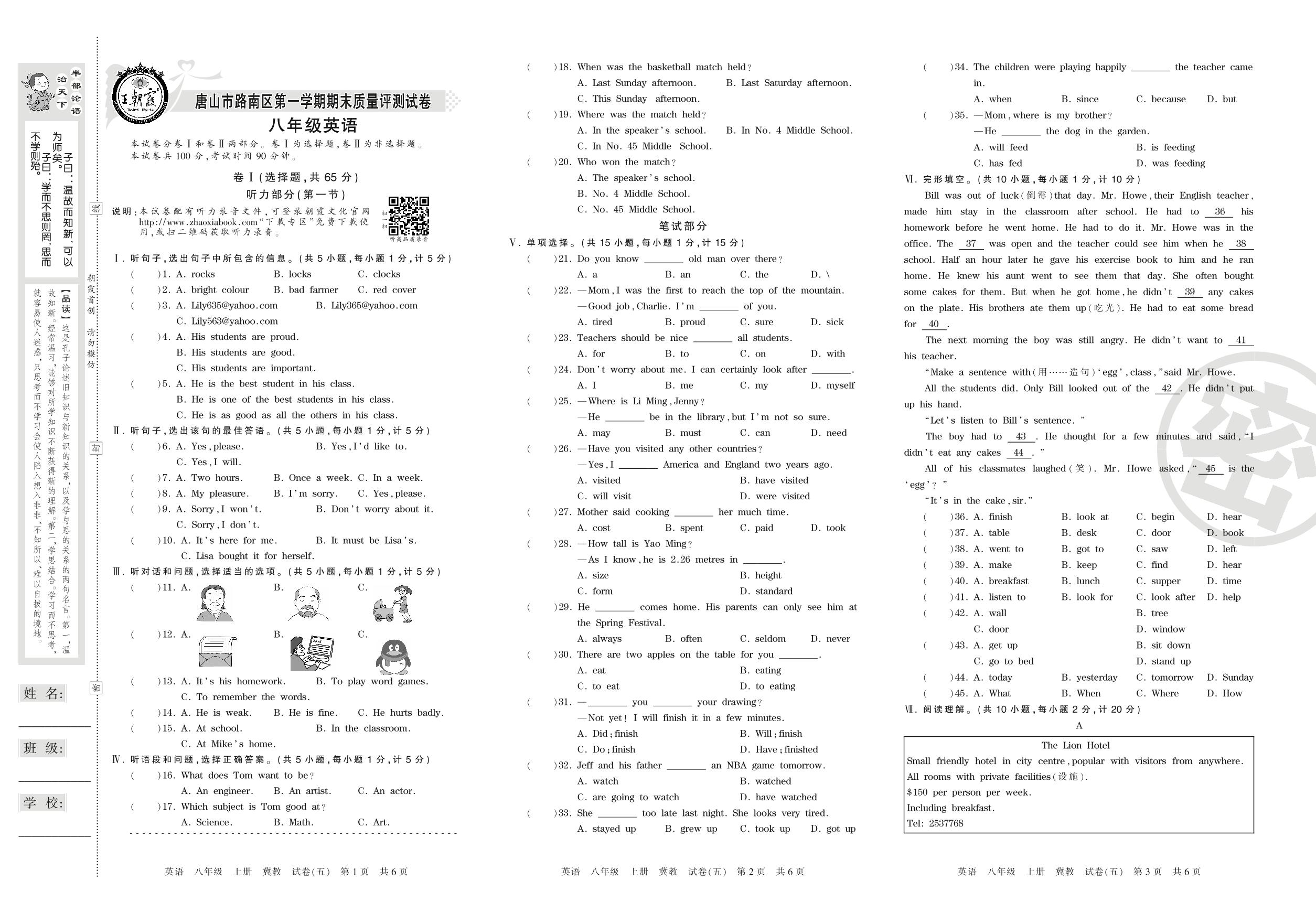 2016-2017学年第一学期唐山市路南区八年级英语试卷(冀教版)【5】