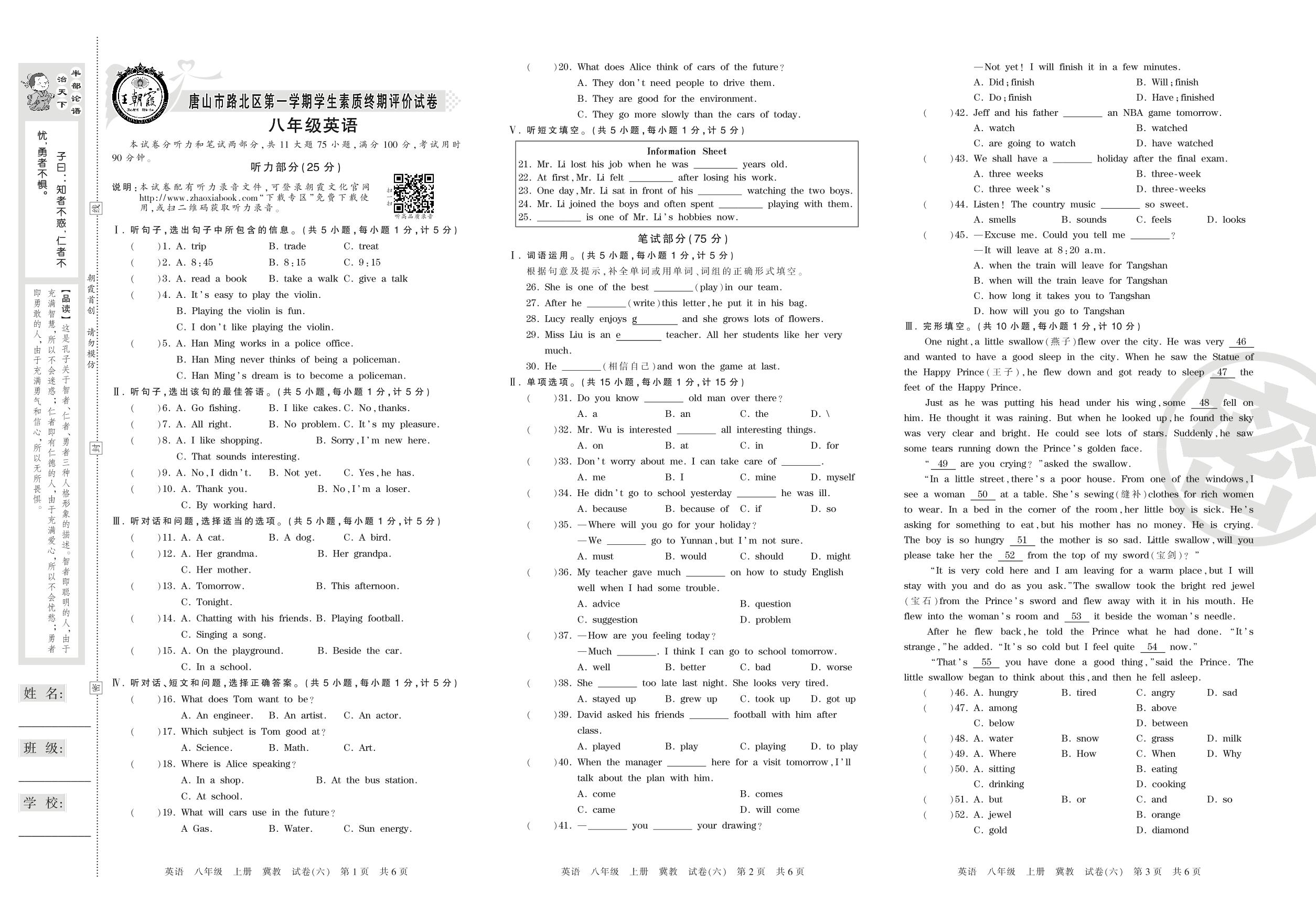 2016-2017学年第一学期唐山市路北区八年级英语试卷(冀教版)【6】