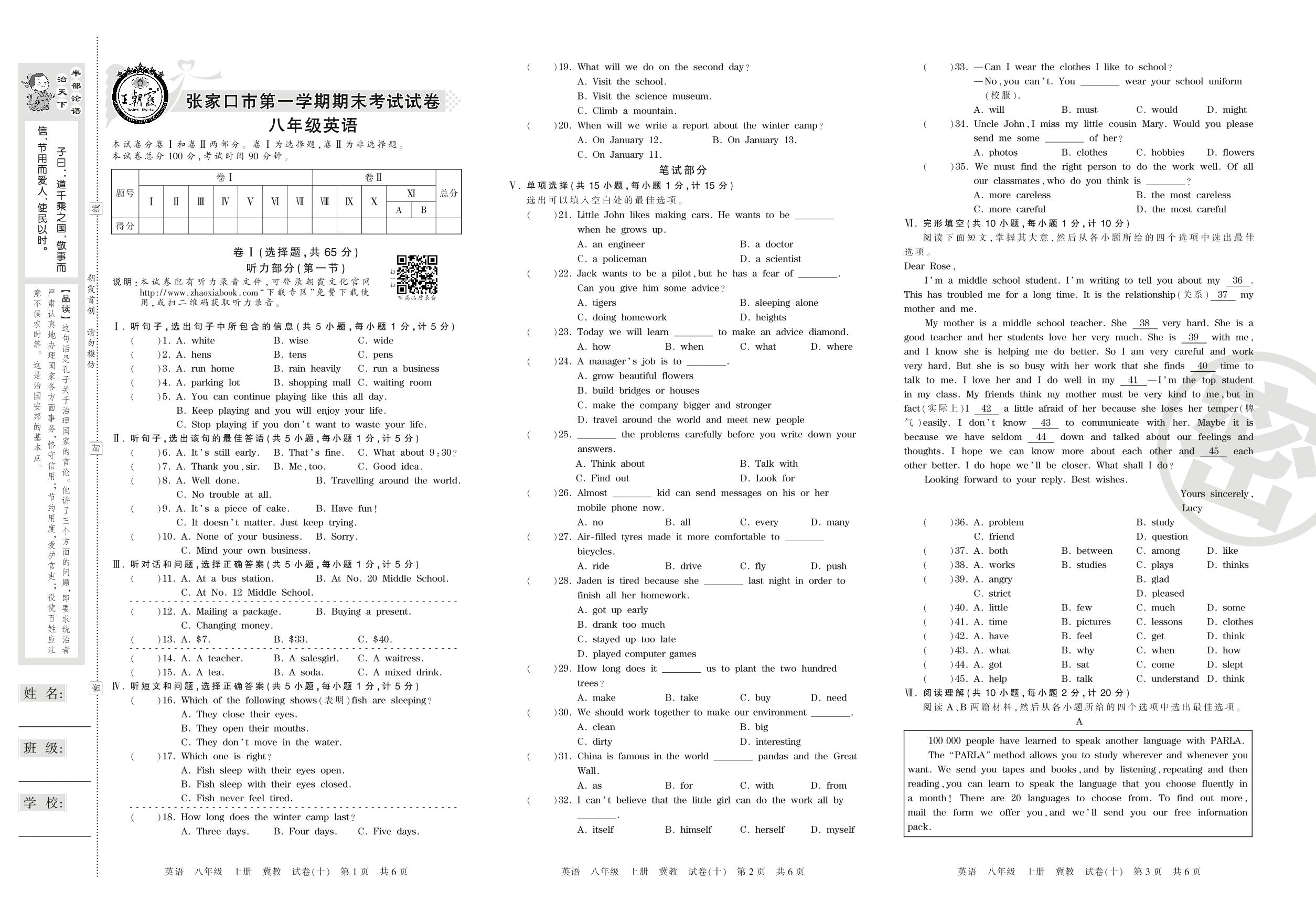 2016-2017学年第一学期张家口市八年级英语试卷(冀教版)【10】