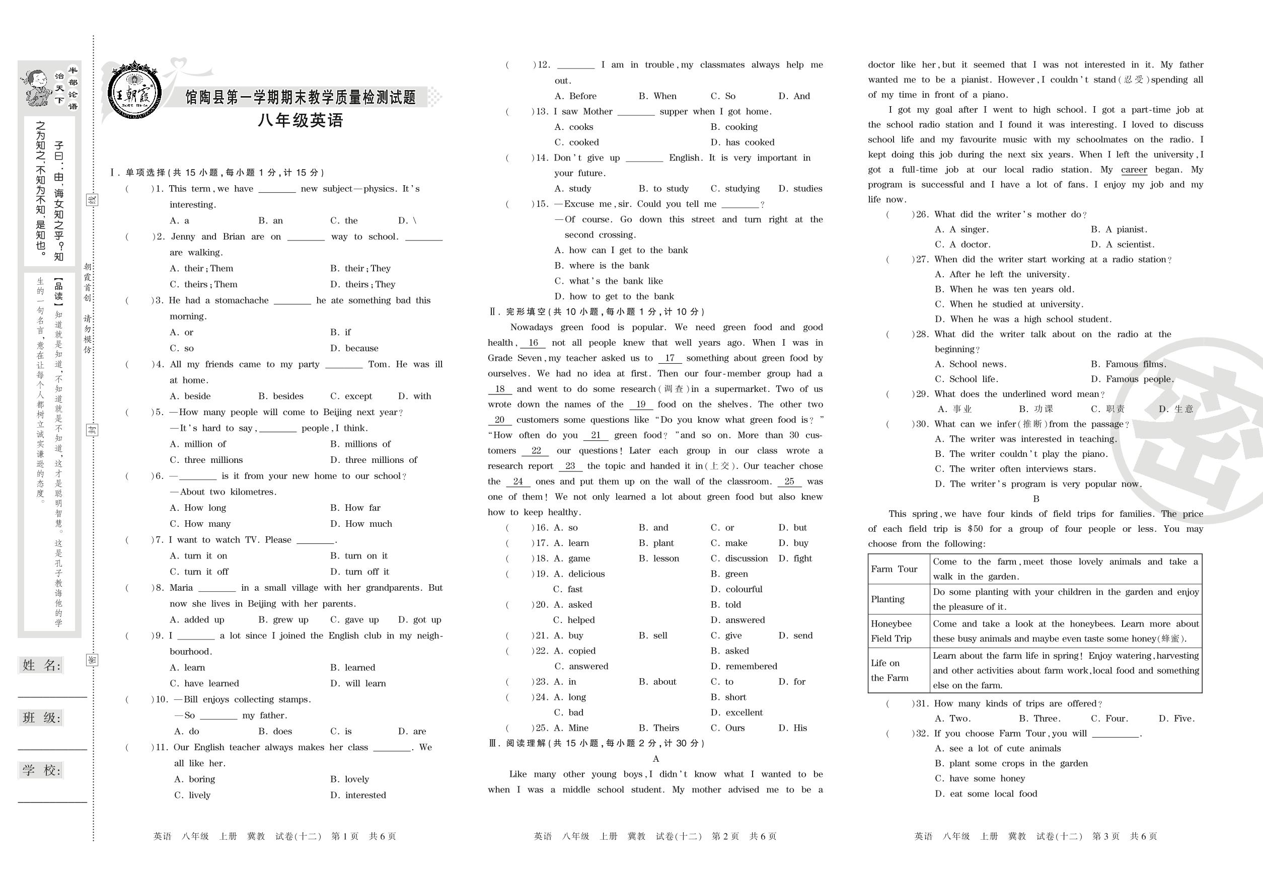 2016-2017学年第一学期邯郸市馆陶县八年级英语试卷(冀教版)【12】