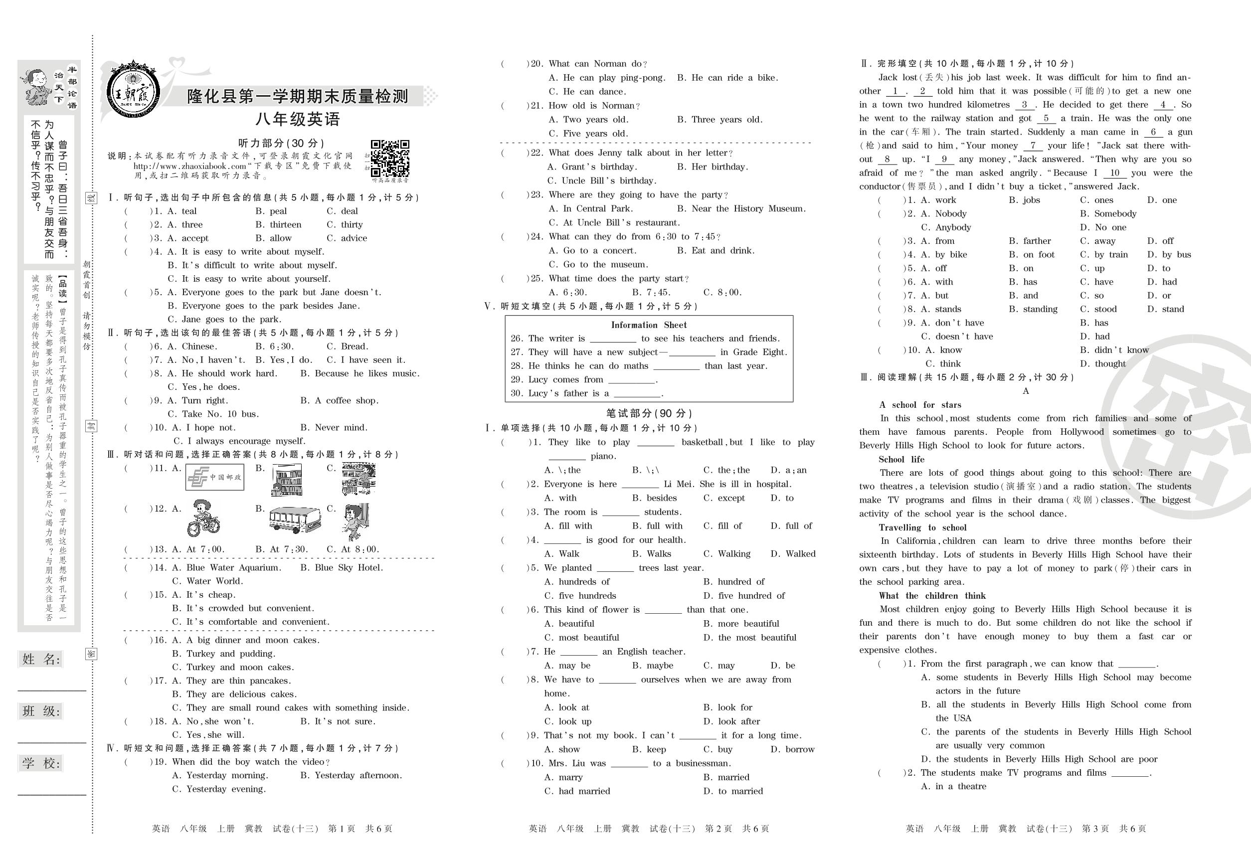 2016-2017学年第一学期承德市隆化县八年级英语试卷(冀教版)【13】