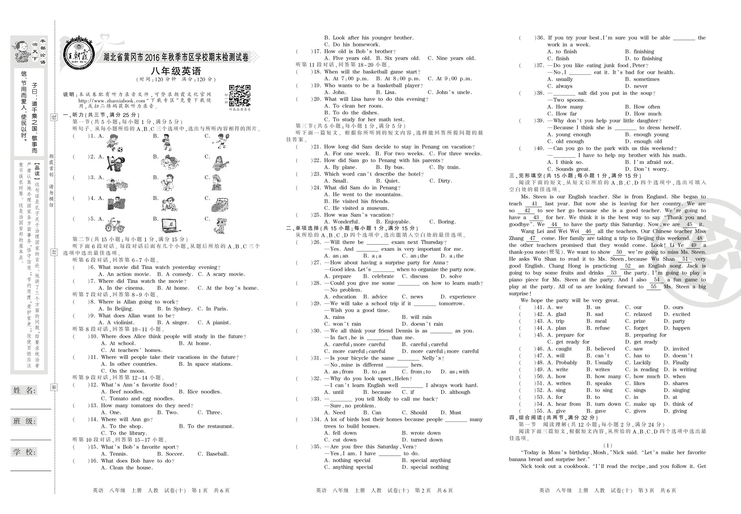 2016-2017学年第一学期湖北省黄冈市八年级英语试卷(人教版)_R210809124340【10】