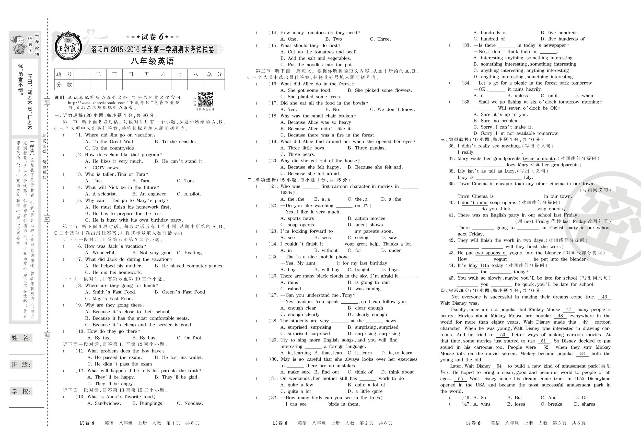 2015-2016学年第一学期洛阳市八年级英语试卷(人教版)【6】