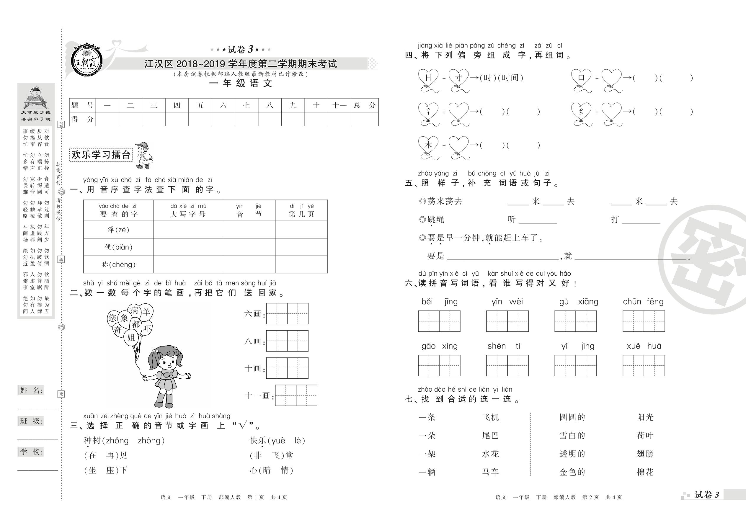 2018-2019学年第二学期武汉市江汉区一年级语文试卷(人教版)【3】