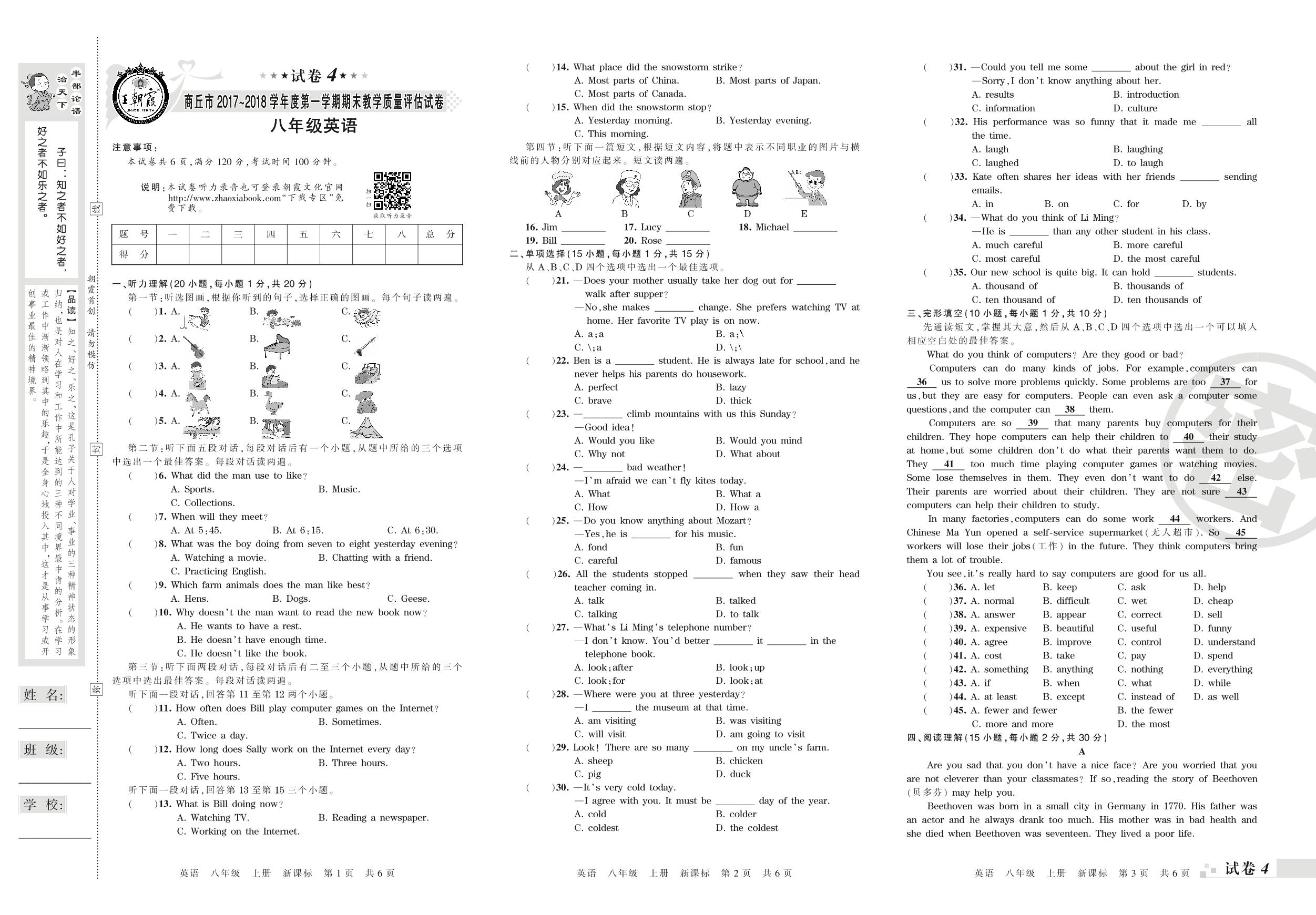 2017-2018学年第一学期商丘市八年级英语试卷(新课版)【4】