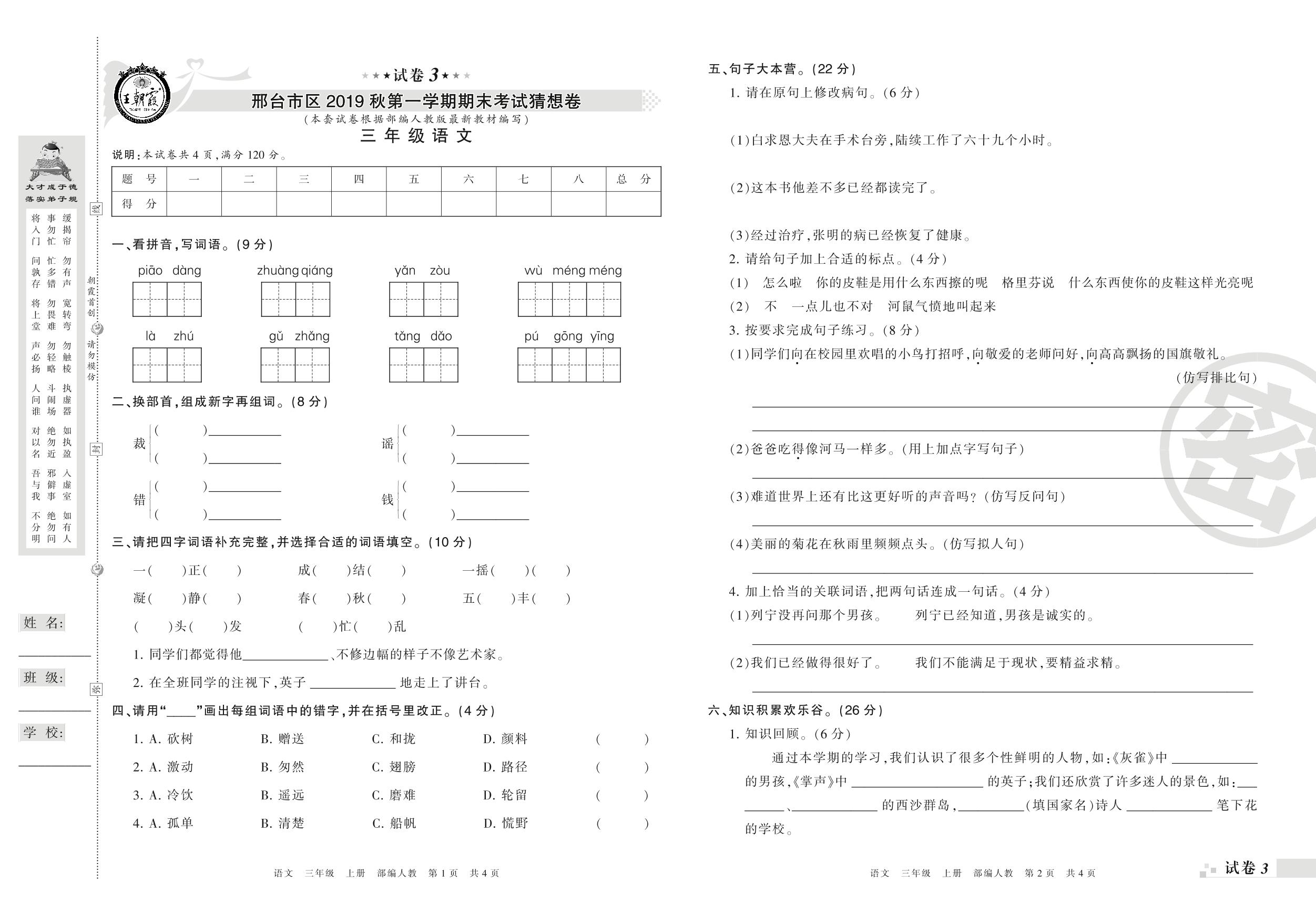 2018-2019学年第一学期邢台市区猜想卷三年级语文试卷(人教版)【3】