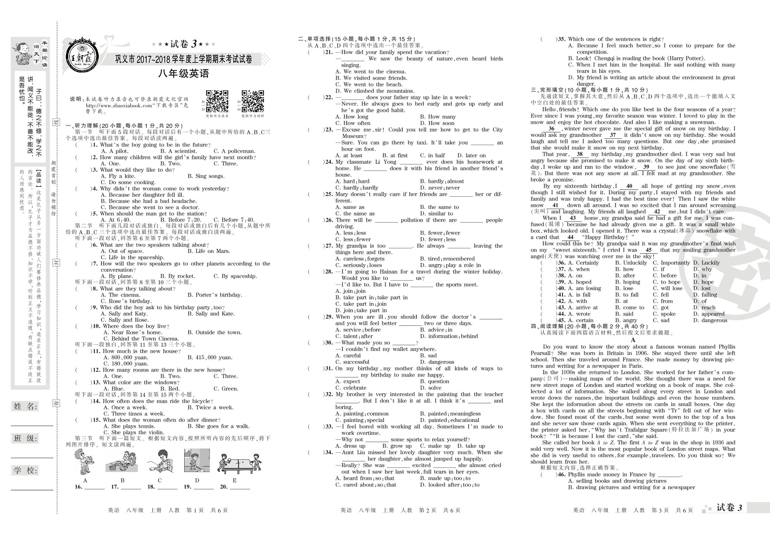 2017-2018学年第一学期巩义市八年级英语试卷(人教版)【3】