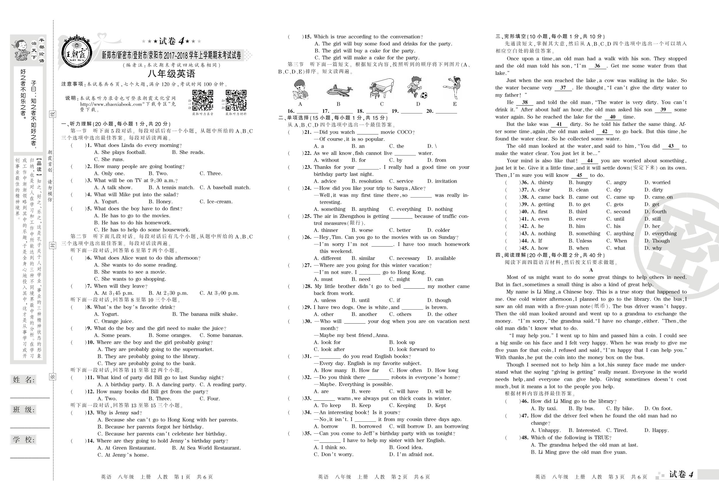 2017-2018学年第一学期新郑市新密市登封市荥阳市八年级英语试卷(人教版)【4】