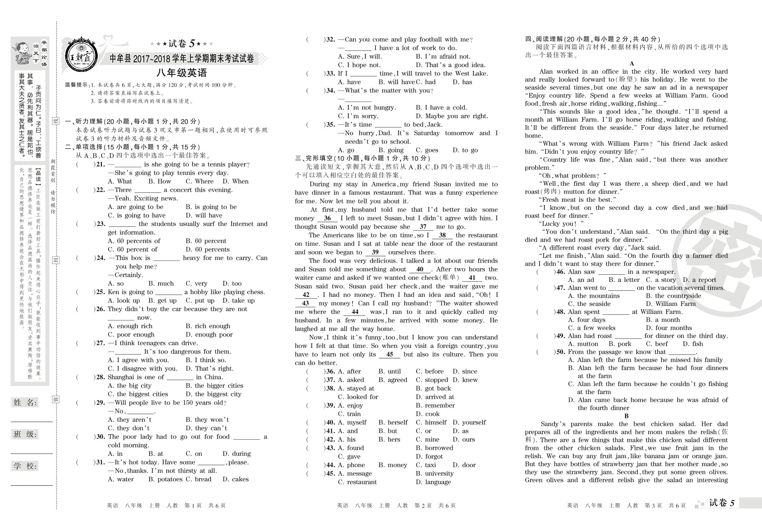 2017-2018学年第一学期郑州市中牟县八年级英语试卷(人教版)【5】
