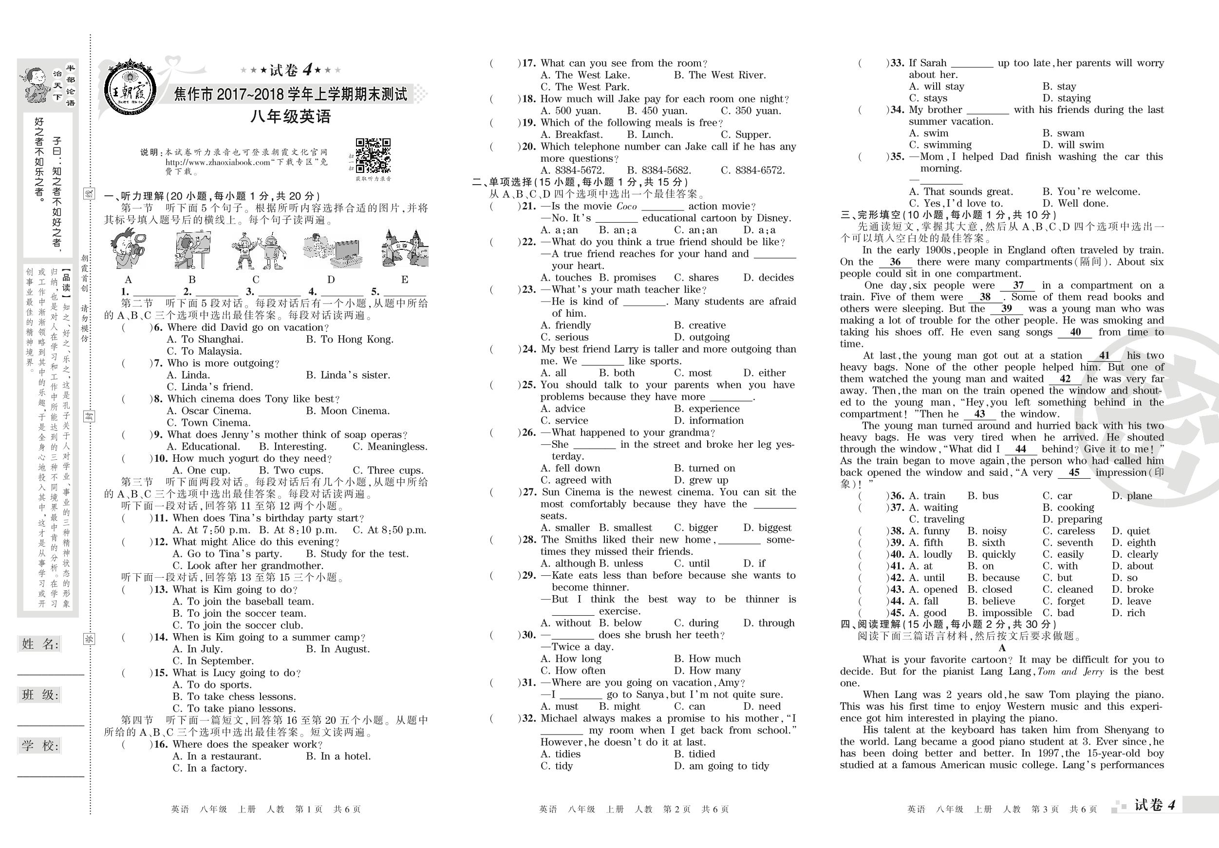 2017-2018学年第一学期焦作市八年级英语试卷(人教版)【4】