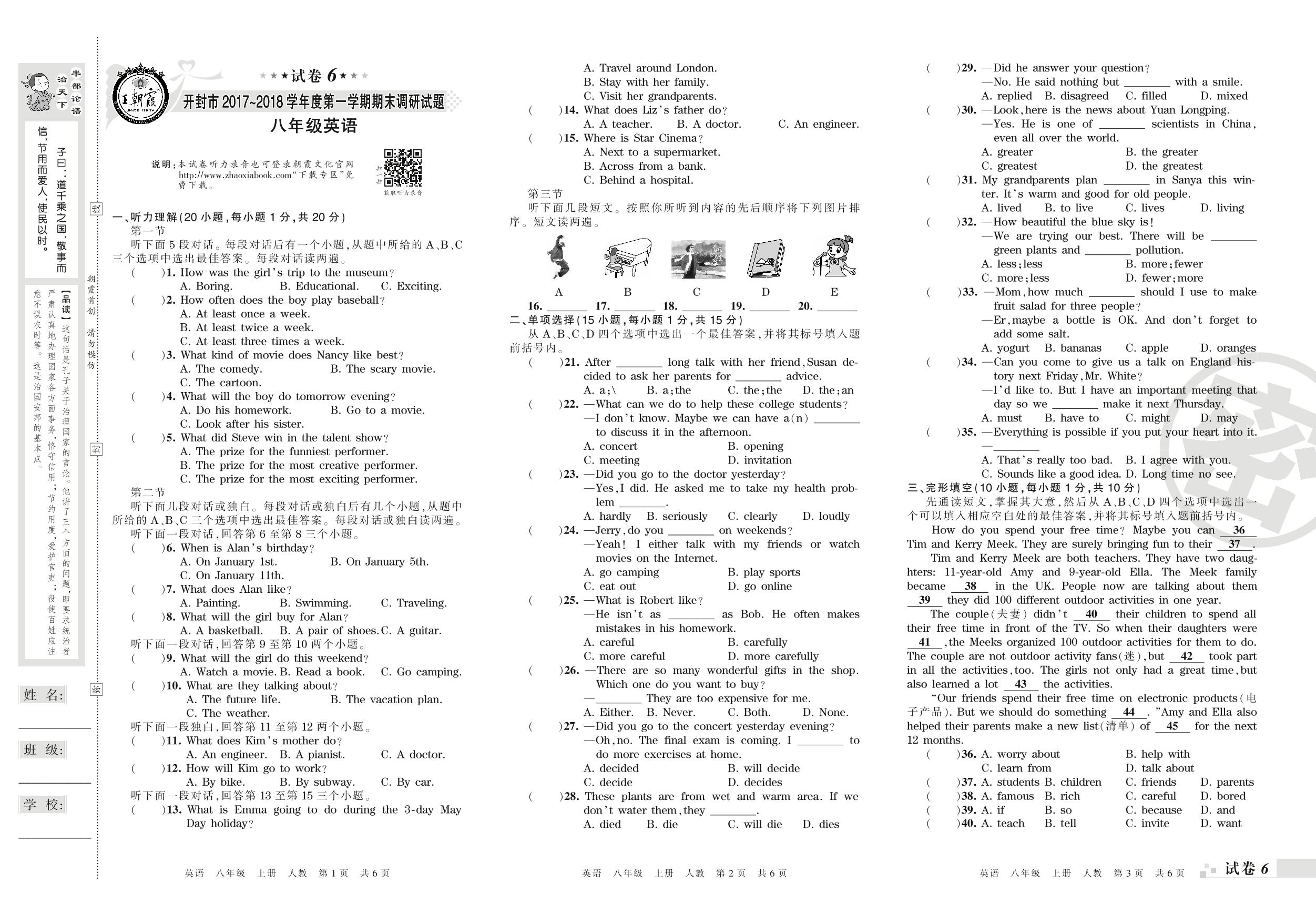 2017-2018学年第一学期开封市八年级英语试卷(人教版)【6】