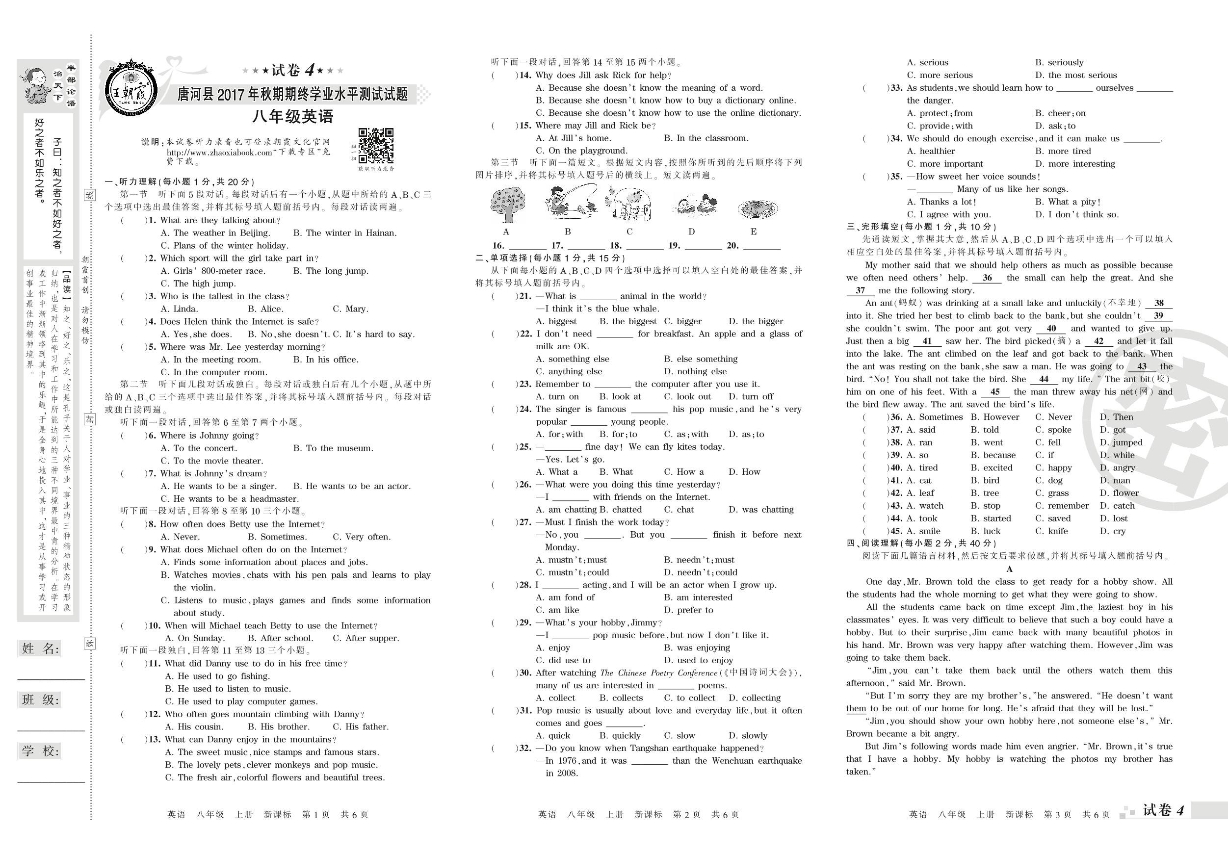 2017-2018学年第一学期南阳市唐河县八年级英语试卷(新课版)【4】
