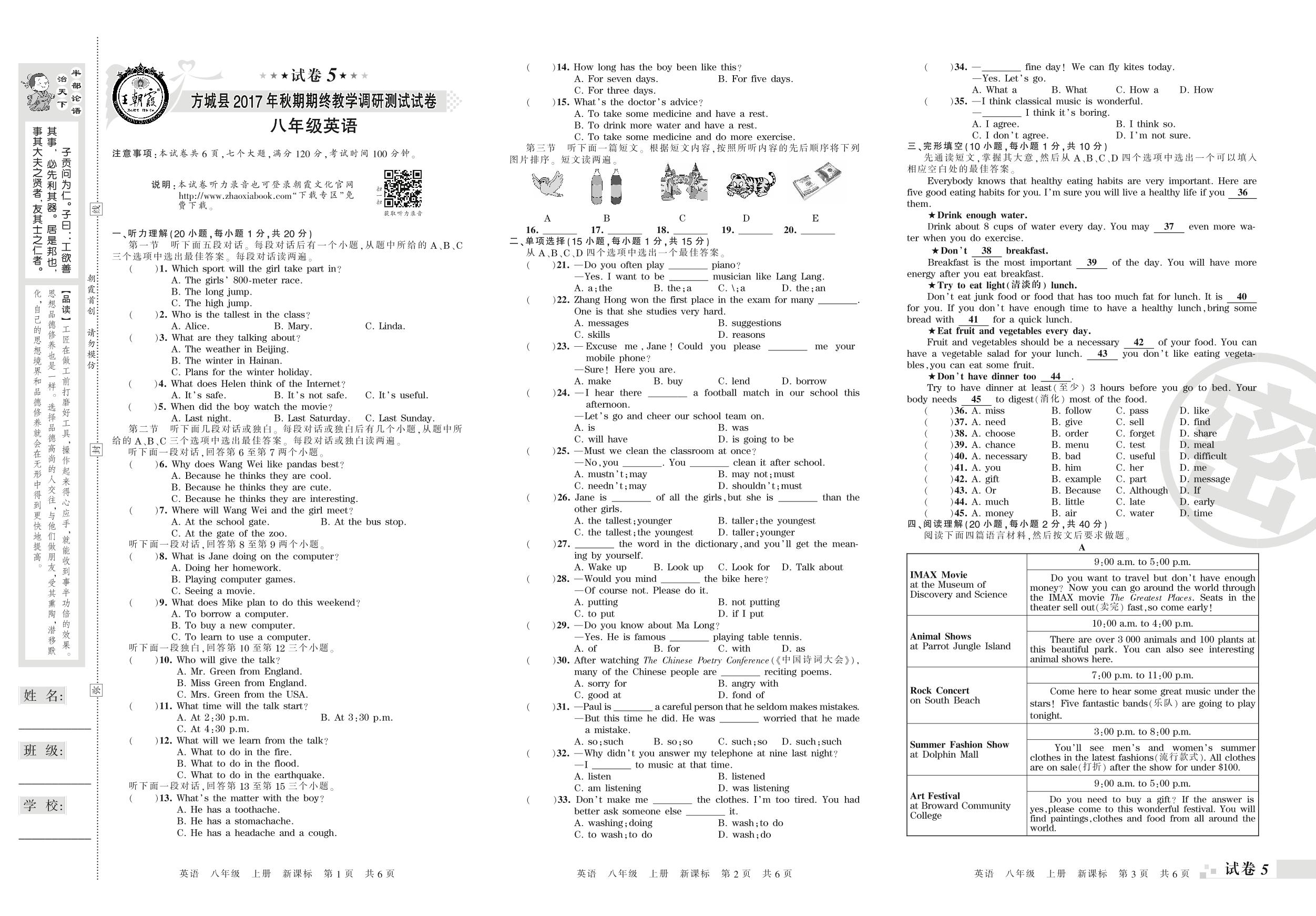 2017-2018学年第一学期南阳市方城县八年级英语试卷(新课版)【5】
