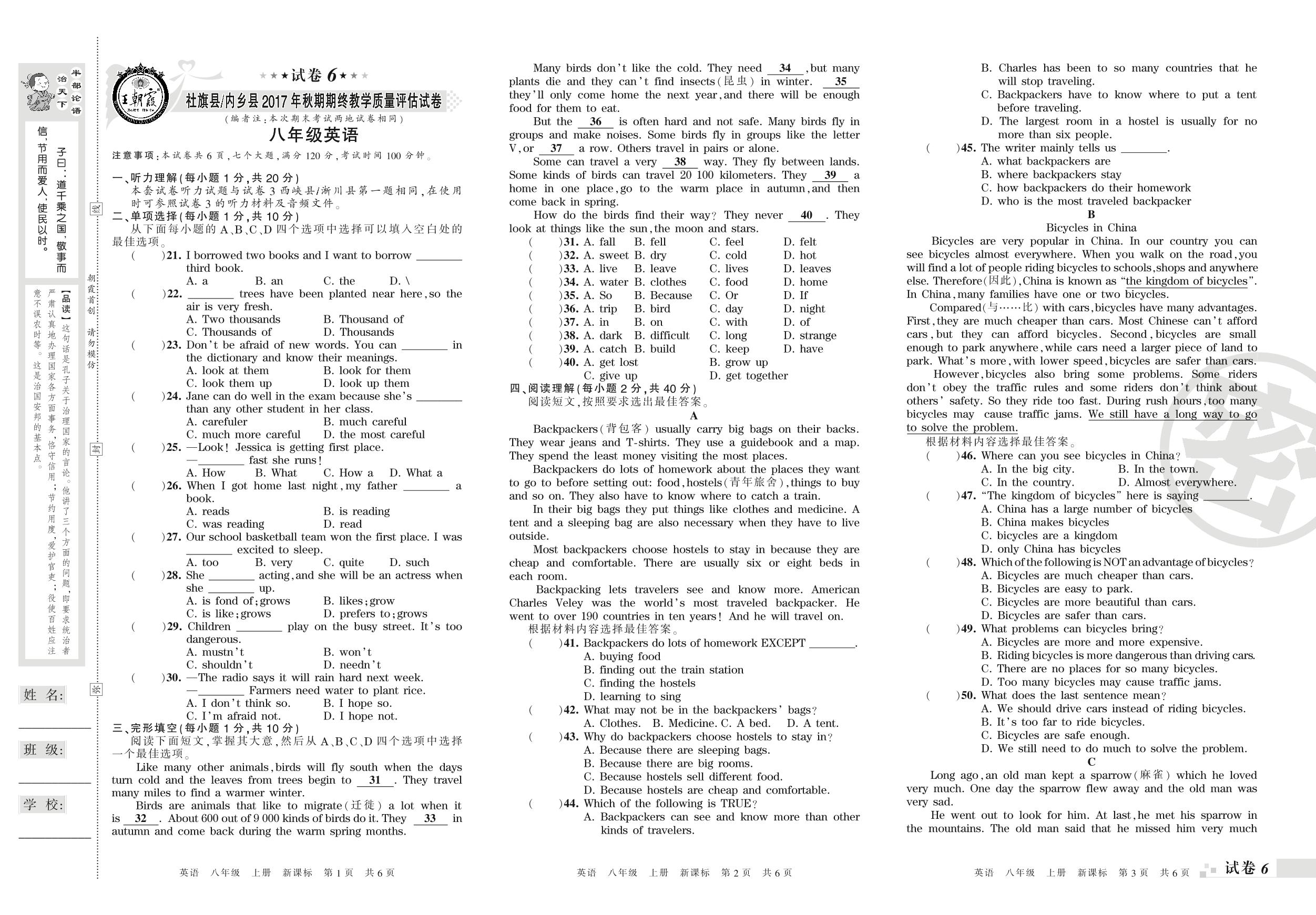 2017-2018学年第一学期南阳市社旗县(内乡县)八年级英语试卷(新课版)【6】