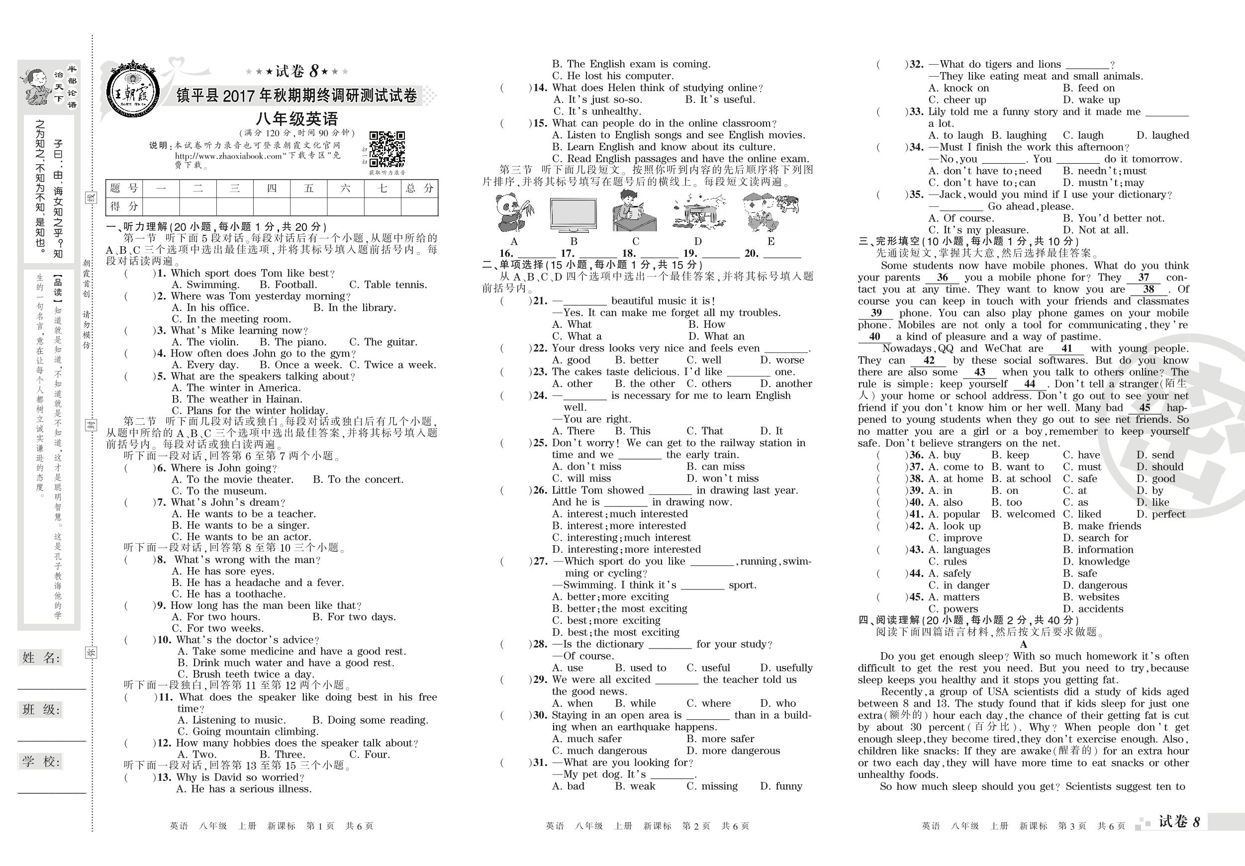 2017-2018学年第一学期南阳市镇平县八年级英语试卷(新课版)【8】