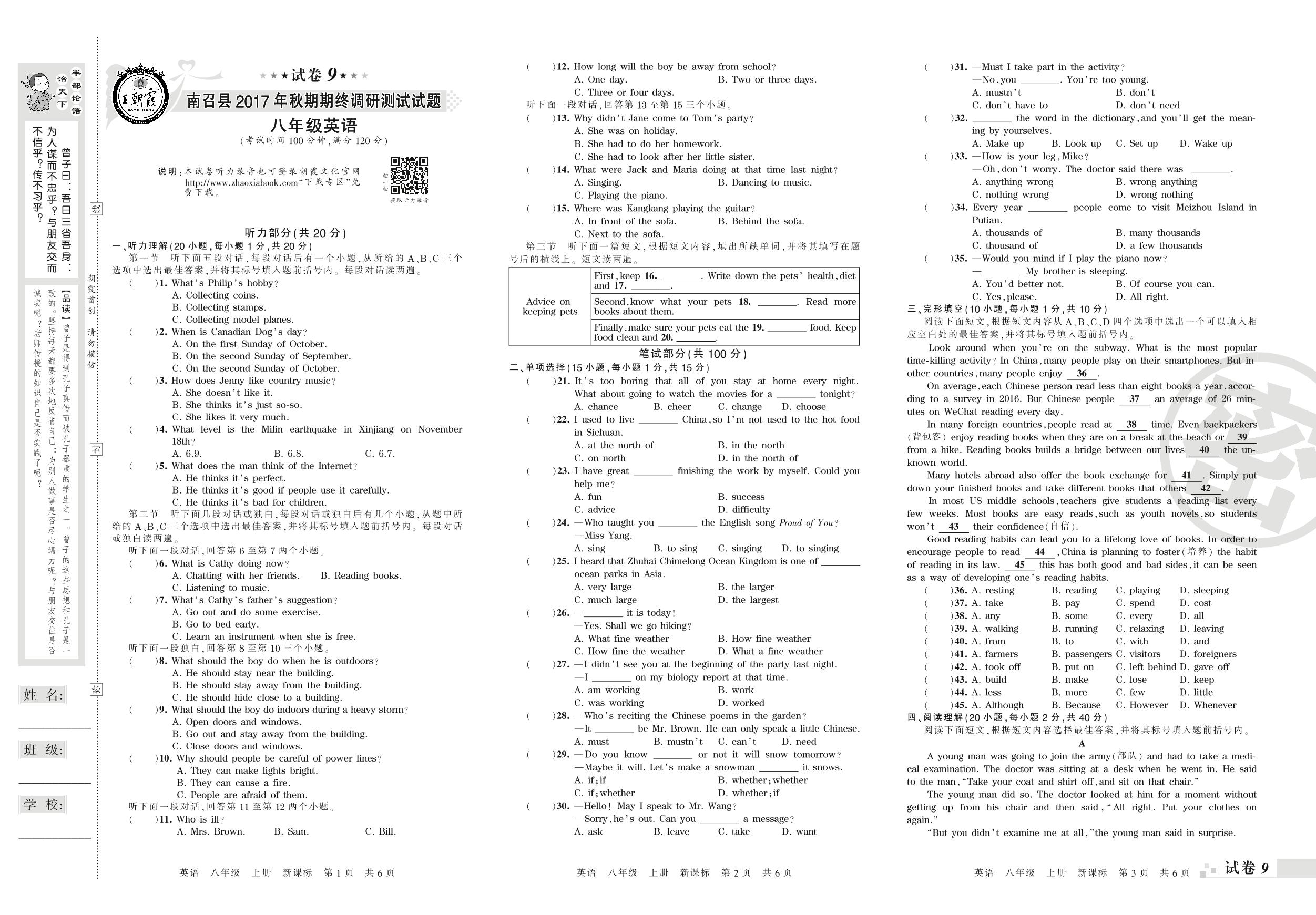 2017-2018学年第一学期南阳市南召县八年级英语试卷(新课版)【9】