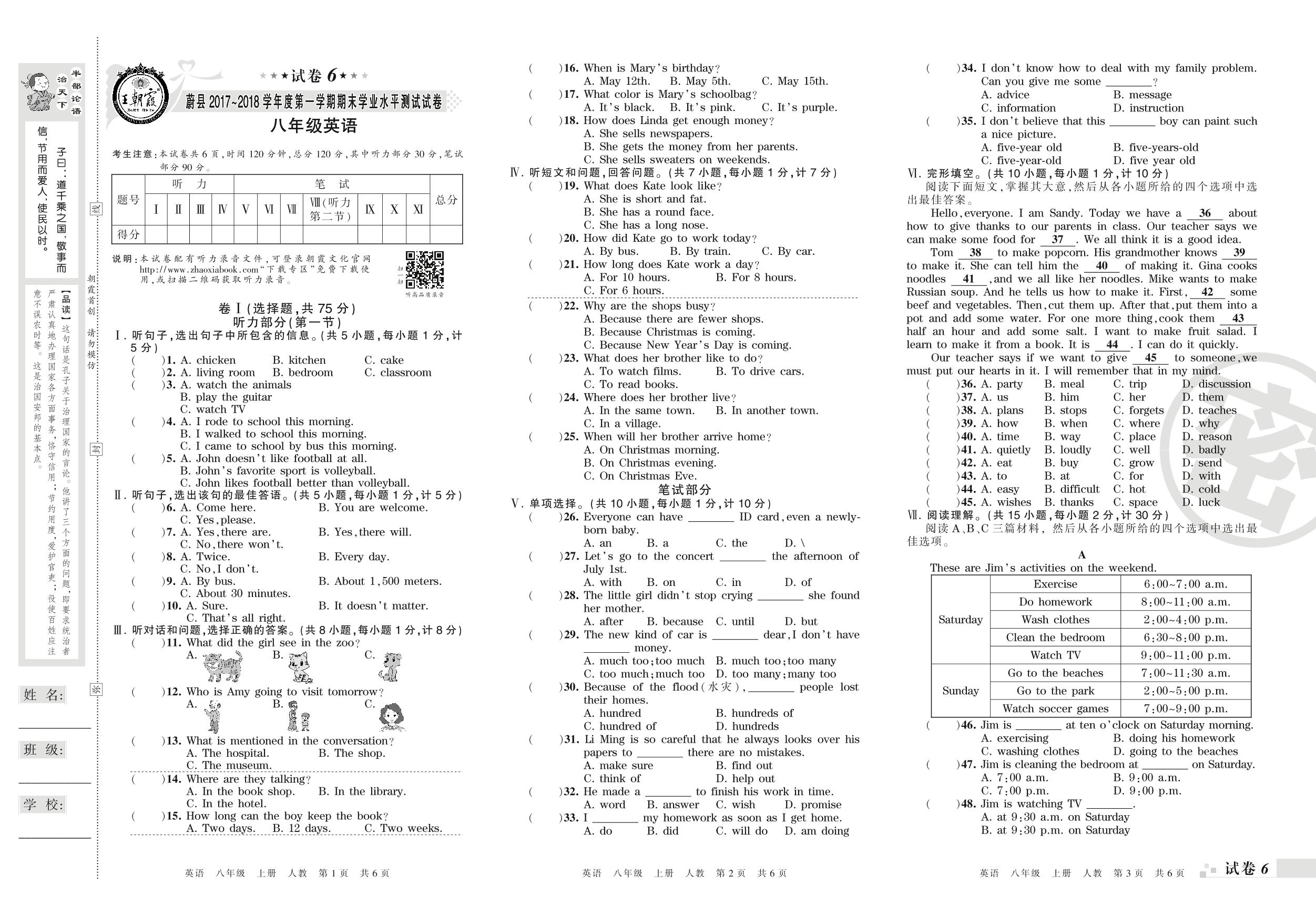 2017-2018学年第一学期张家口市蔚县八年级英语试卷(人教版)【6】